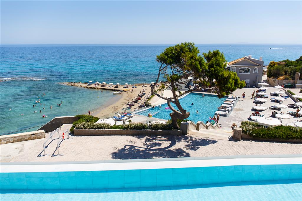 piesočnatá pláž s jemným pieskom a pozvoľným vstupom do mora • priamo pred hotelom • slnečníky a ležadlá (za poplatok 15-20€/plažový set/deň) • plážové osušky za depozit 10 EUR/ks vymieňané 2 x za pobyt • vodné športy (za poplatok) • plážový bar (za poplatok) • terasy nad plážou (ležadlá a slnečníky zdarma)