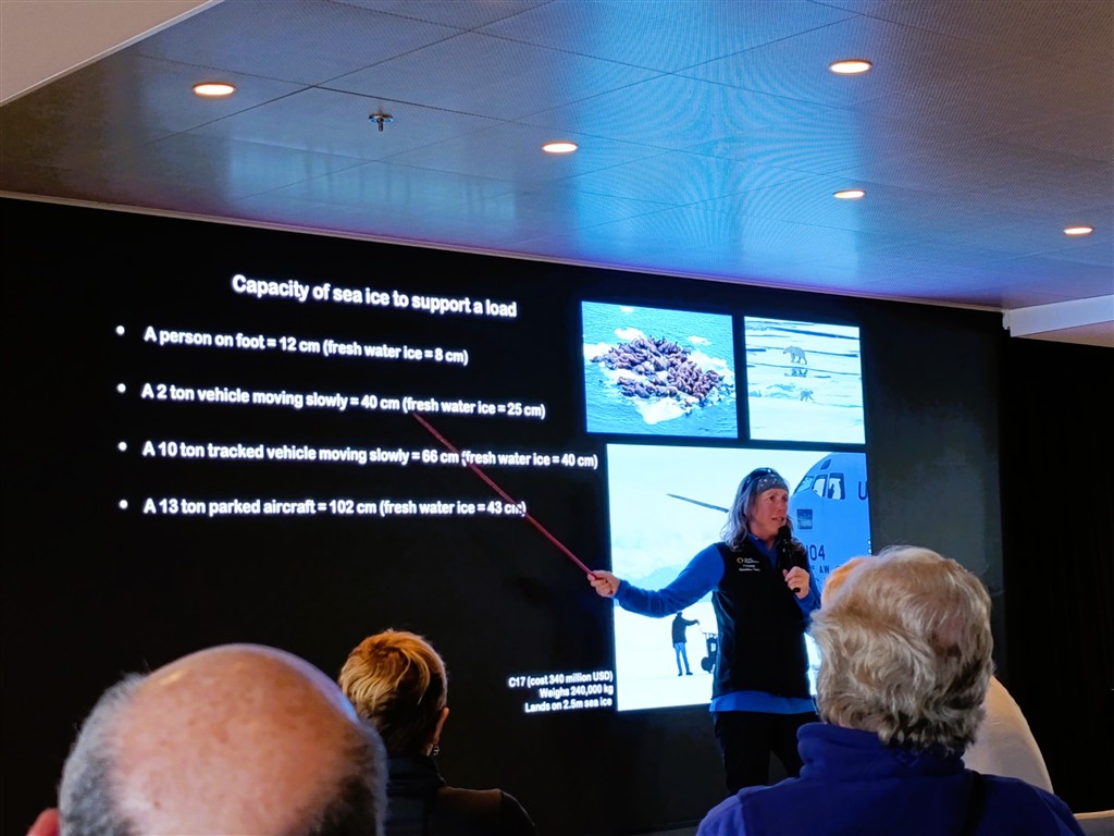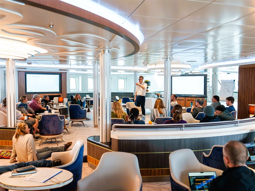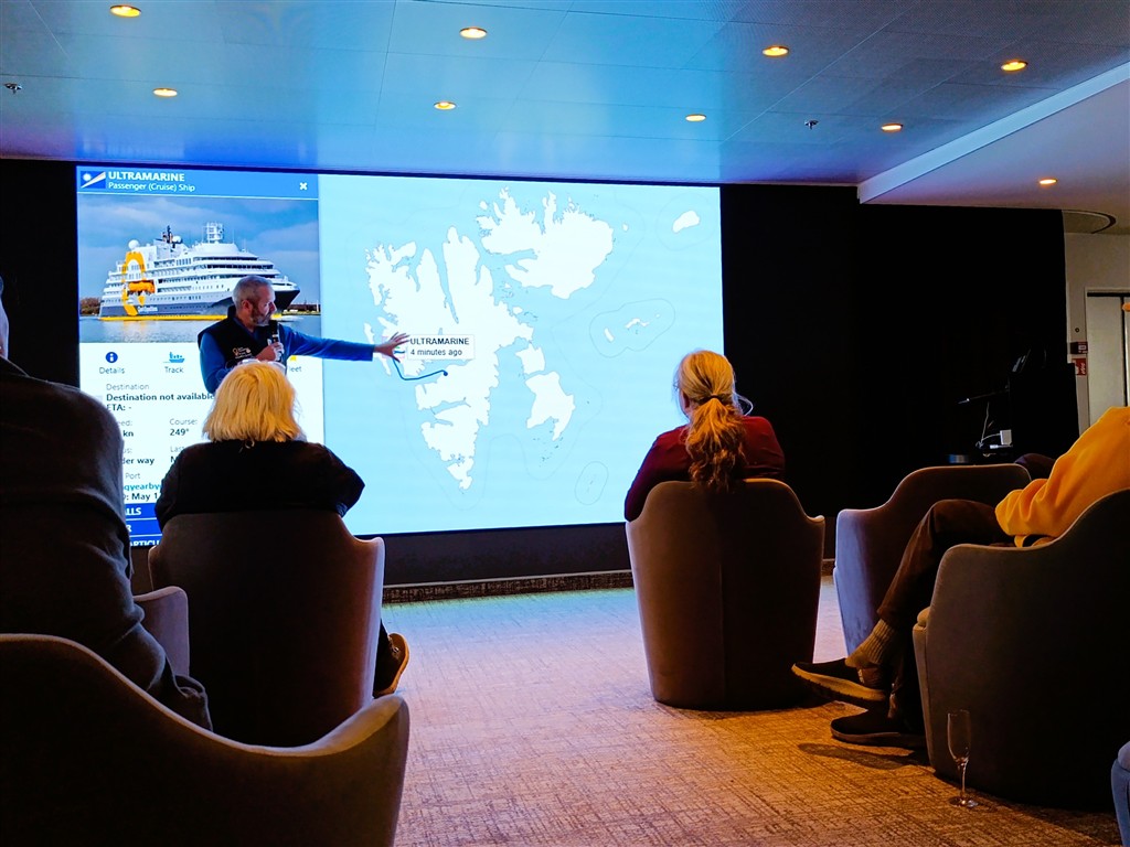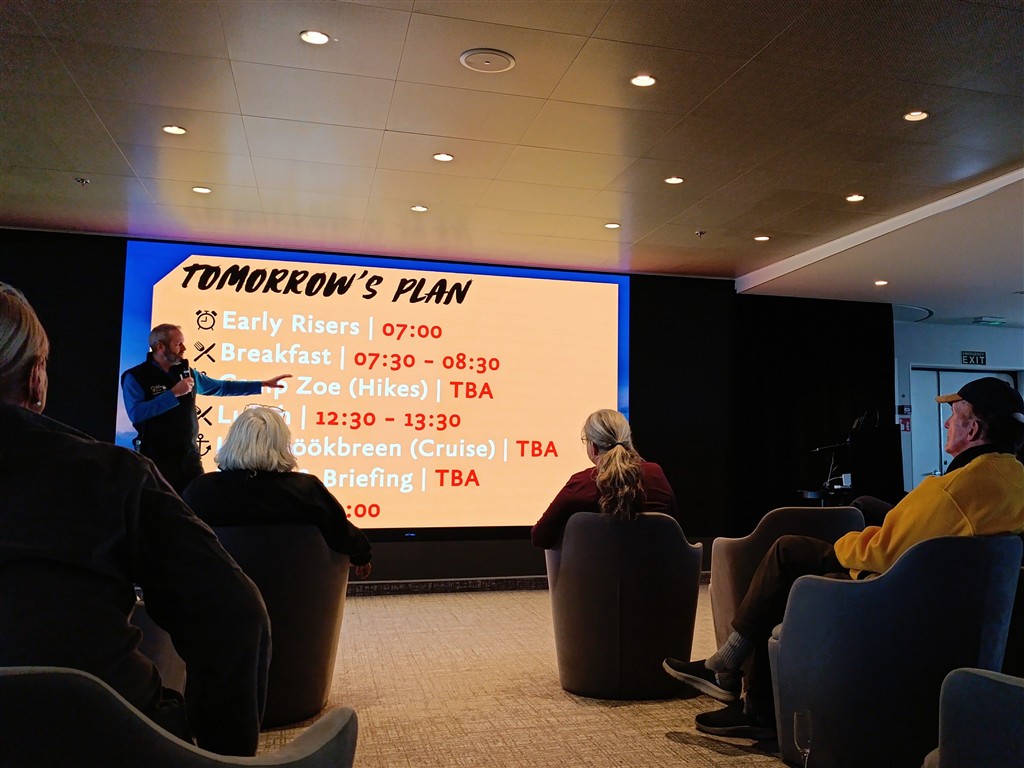 Vyrážame na Špicbergy. Expedičný tím nám vypĺňa čas bohatými prednáškami. História, politika s prepojením na tému Arktída, fauna, flóra, klimatológia, ekológia. Informácie, ktoré si nikde nikdy neprečítate. Viete prečo sú mláďata medveďa také malé ? Viete, že jeho srsť nie je biela, ale transparentná? Koľko foriem ľadu poznáme a koľko cm by už udržalo človeka alebo auto ? Ako spočítať 40 000 vtákov kvôli výsumu a nahradí prácu vedcov AI ? Stovky fotografii, štatistík, tabuliek...Prednášky sú veľkým prínosom a hodnotíme ich ako ďalší nenahraditeľný zážitok. Ostatní sprievodcovia skenujú okolie a akonáhle spozorujú veľryby alebo iné zaujímavosti, prednáška bude prerušená. Berieme ďalekohľady a nechávame sa unášať divočinou.