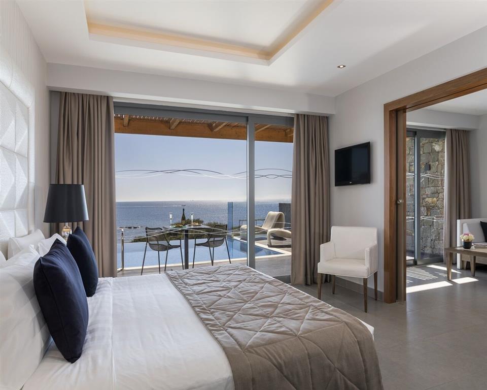 Room superior deluxe sea view (30 m2, pre 2-3 osoby, terasa, výhľad na more) • Junior Suite so súkr. bazénom (30 m2, pre 2 soby, terasa so súkromným bazénom) • Superior Junior Suite so súkr. bazénom SV (37 m2, pre 2-3 osoby, terasa s posedením a súkr. bazénom, výhľadna more) Superior Junior Suite so súkr. bazénom upper floor (37 m2, pre 2-3 osoby, terasa s posedením a súkr. bazénom, výhľad na more) • Mediterranean suita (44 m2, pre 2 osoby, terasa s posedením a súkr. bazénom, výhľad na more) • Executive Suite SV so súkr. bazénom (59 m2, pre 2-4 osoby, spálňa a obývacia miestnosť, terasa s posedením a súkr. bazénom, výhľad na more)