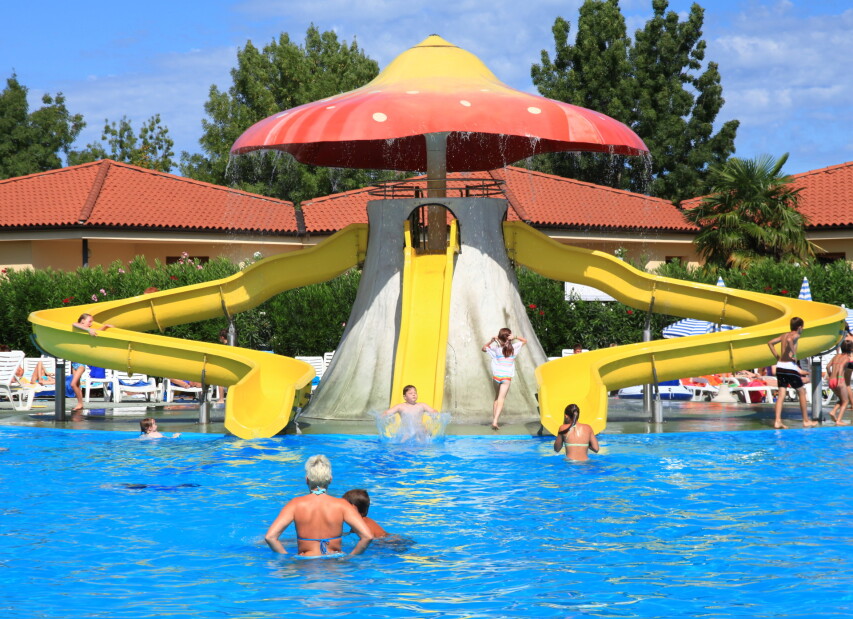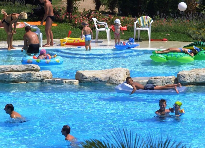 bazén 5 bazénů (pro dospělé, olympijský, dětský se skluzavkami a prolézačkami), nutná koupací čepice v olympijském bazénu
