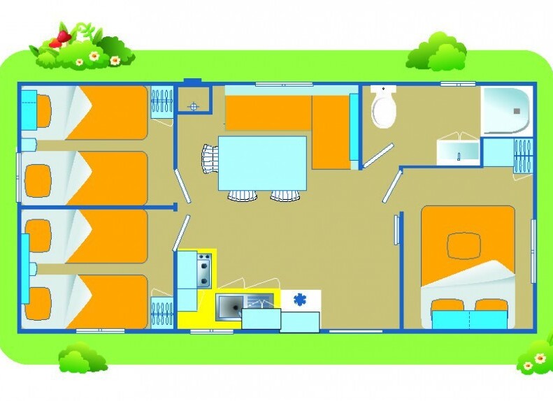 ložnice s manželskou postelí, ložnice se dvěma lůžky (z nichž jedno je sklápěcí) a třetím výsuvným lůžkem (je povoleno pouze dítě, max. 150 cm a max. 60 kg), obývací pokoj s gaučem a kuchyňským koutem, 5. a 6. osoba za poplatek.