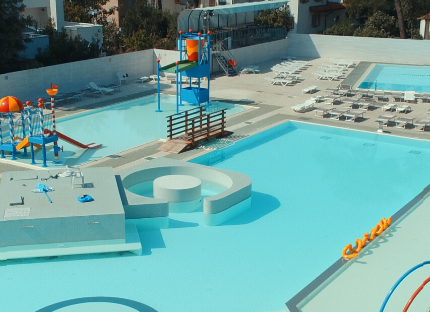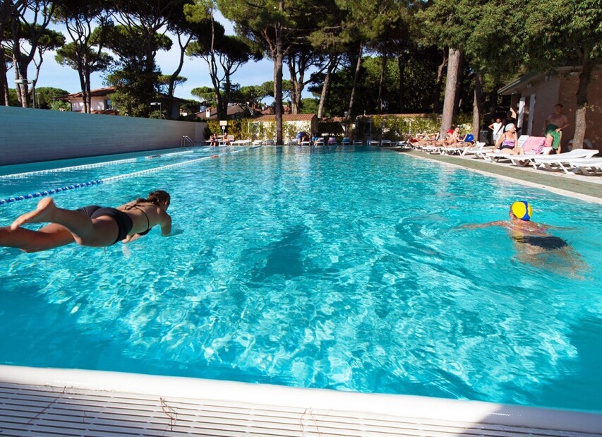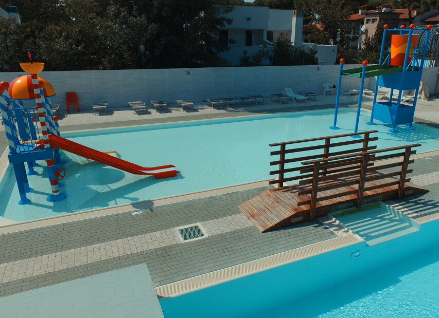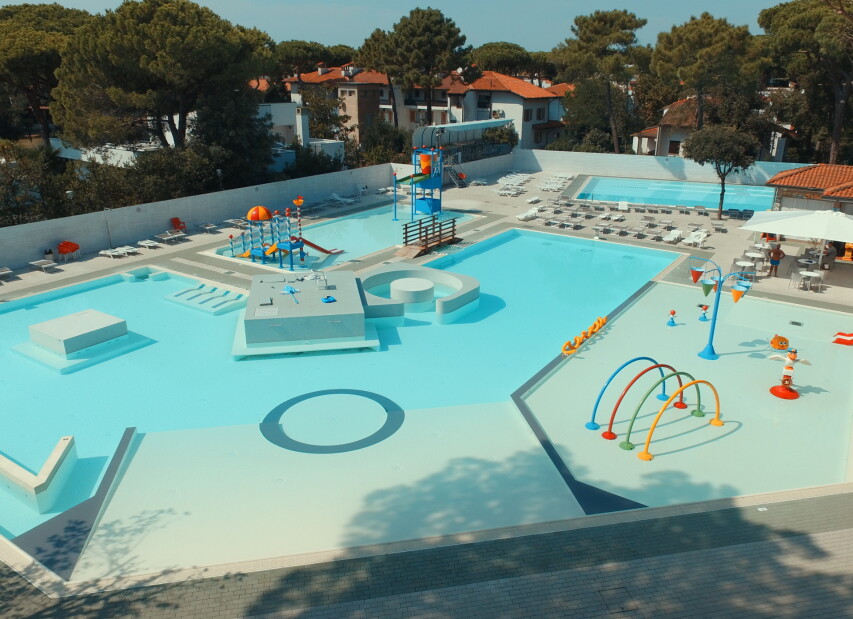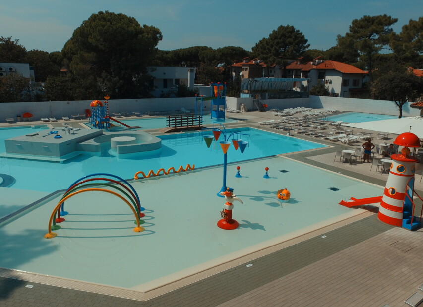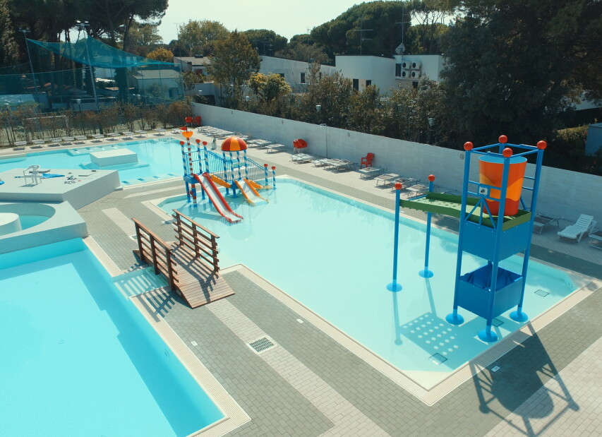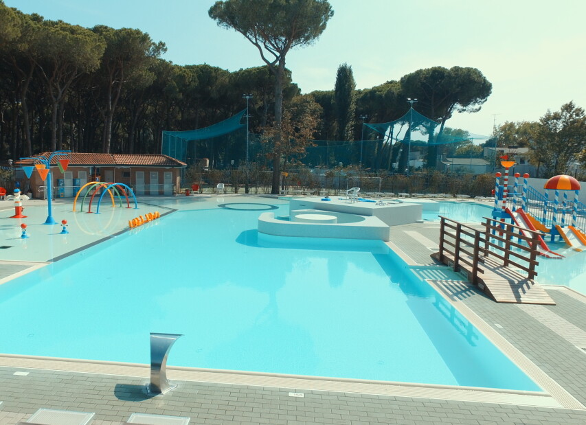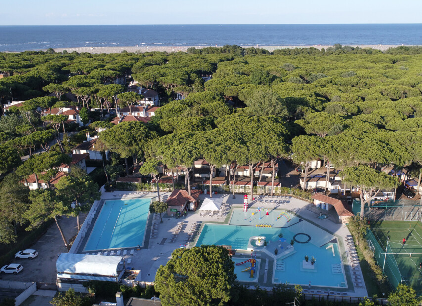 Camping MARE E PINETA (Via delle Acacie) je součástí rozlehlého ležícího přímo u privátní pláže. Klientům je k dispozici bazén pro dospělé, dále nově vybudovaný vodní park s bazény a atrakcemi pro děti (v provozu cca 16.05.-20.09.2026, pro ubytované klienty zdarma, pro návštěvníky za poplatek), restaurace, pizzerie, bar, supermarket, prádelna, bankomat a parkoviště. Komplex nabízí bohaté sportovní vyžití i zábavné animace (v provozu cca 01.06. - 06.09.2026). Klienti mohou využít za poplatek lékařské služby, stanice pro dobíjení elektromobilů, fitness centrum se spinningem, saunou a solární terasou. Wi-Fi je k dispozici ve společných prostorách, v centrální části kempu, u bazénu, na pláži a v restauraci. Na pláži lze využít hřiště na plážový volejbal, kurzy windsurfingu, kanoe, lukostřelbu a v bazénu kurzy plavání pro děti i dospělé. V aquaparku jsou k dispozici bazény s dětskými hrami. V centru kempu se nachází dětské hřiště, na zelené ploše mezi kempem a pláží dětské hřiště a na pláži skluzavka a kolotoč.