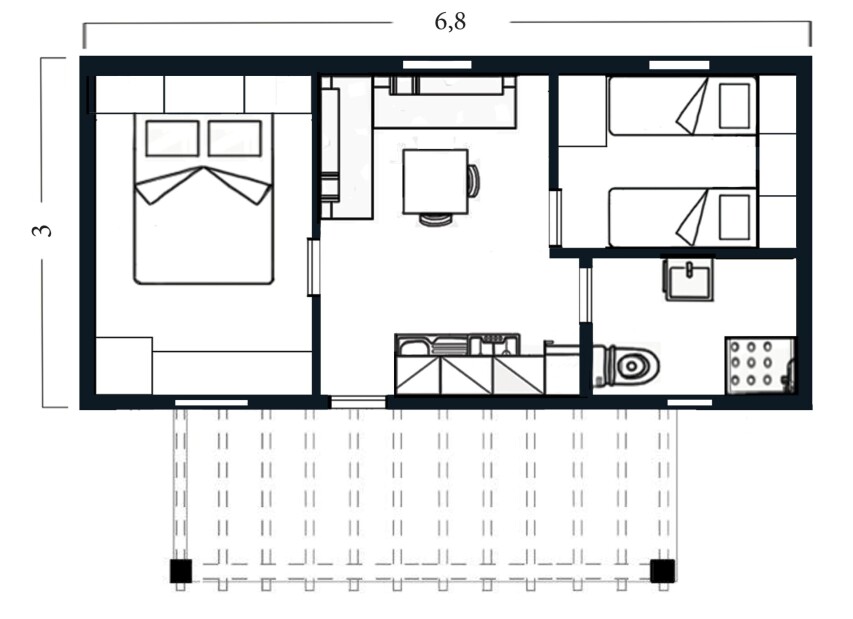 ložnice s manželskou postelí, ložnice se dvěma lůžky a nad nimi vyvýšeným lůžkem (vhodným pouze pro dítě do 50 kg), obývací pokoj s kuchyňským koutem.
