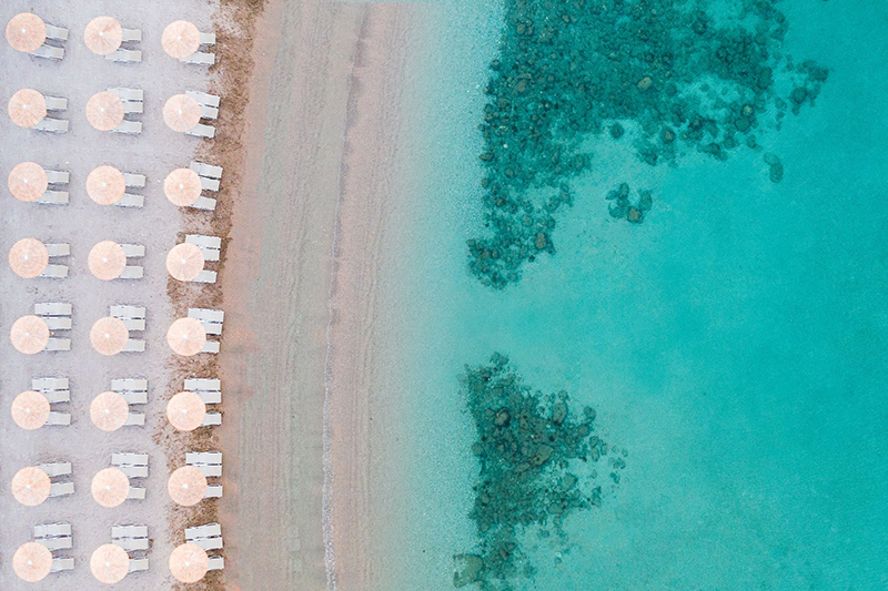 pieskovo-kamienková pláž • pozvoľný vstup do krištáľovo čistého mora • bezplatný plážový servis • centrum vodných športov za príplatok