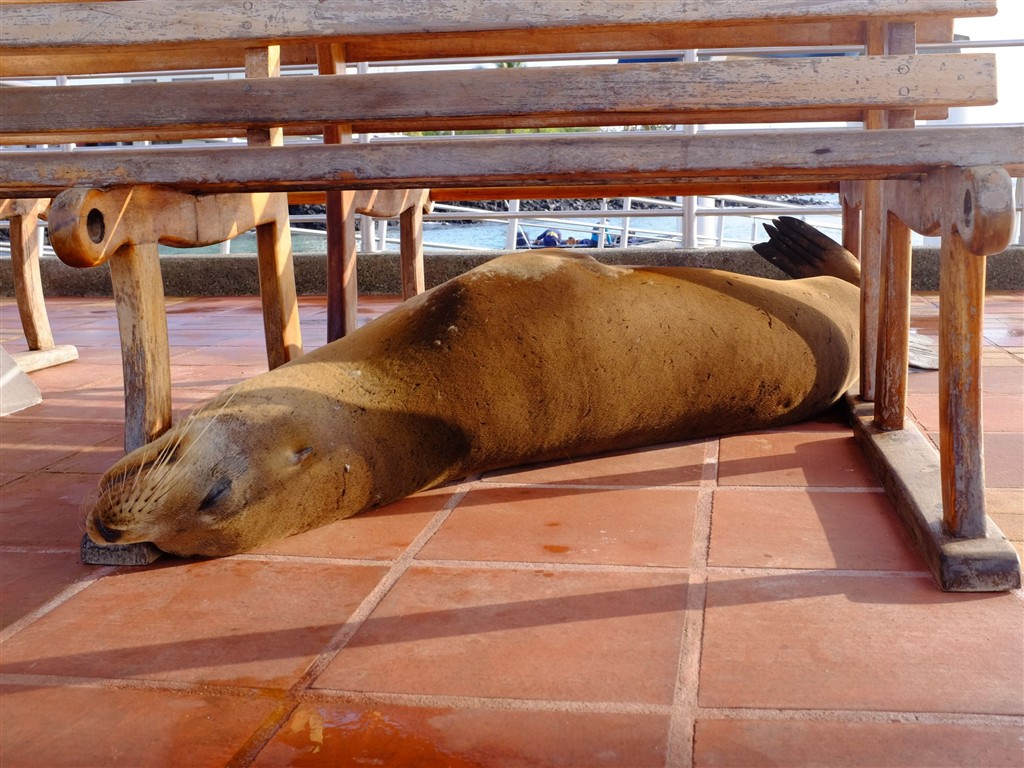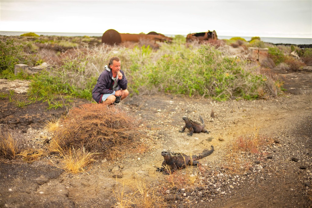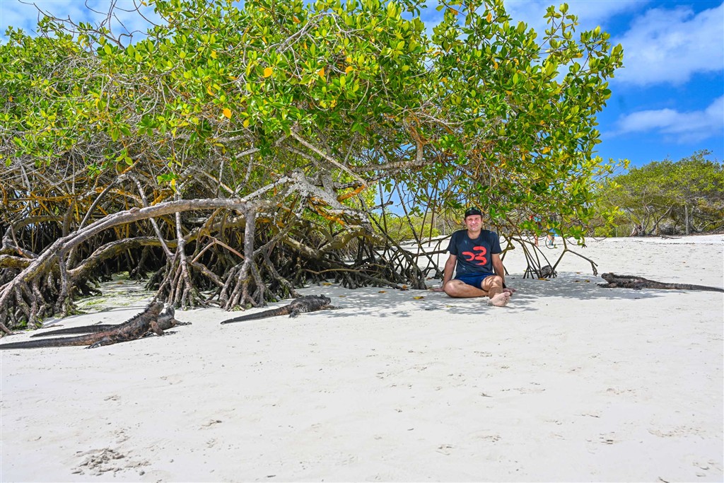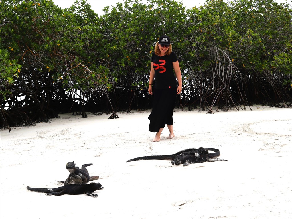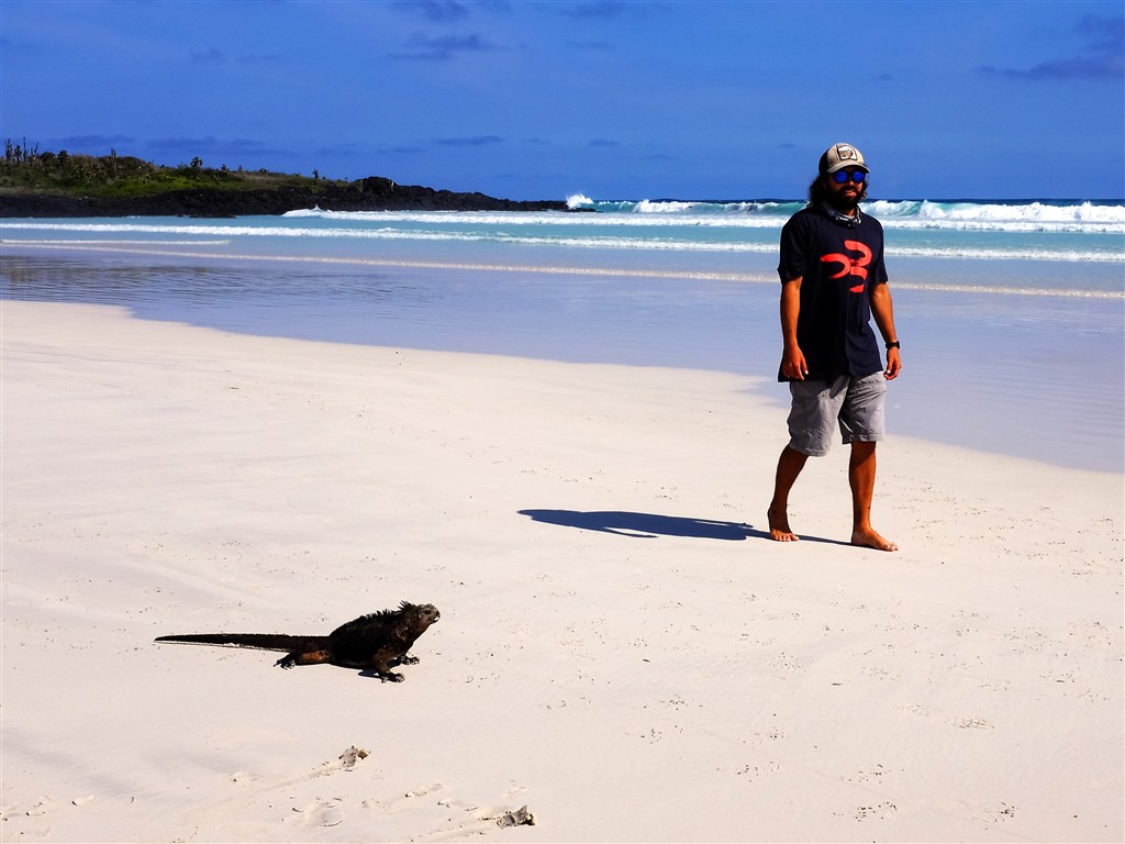 Po raňajkách ihneď vyrážame do Darwinovho centra. Kamenným chodníkom medzi stovkami obrovských kaktusov prichádzame na miesto, ktoré nás uvedie do problematiky ostrovov. Prečo sú Galapágy také známe? Život Charlesa Darwina a čo ho na Galapágoch uchvátilo. Kde žila najslávnejšia korytnačka sveta Osamelý George? Naozaj mal 150 rokov? Dnes chceme vidieť minimálne tucet korytnačiek a zároveň viac druhov. Chceme si pozrieť kostru veľryby a celé múzeum v Darwinovom centre. Chceme vidieť uškatce, loviace pelikány a potom skočiť na pláž. Hodinová prechádzka po najkrajšej pláži ostrova a zrejme aj celých Galapág. Bielučký piesok a modré more..no čo je absolútne unikátne, tak v mori môžete vidieť plávať jaštery – leguány morské. Keď Charles Darwin uvidel plávajúce leguány a všimol si že chvost týchto prajašterov nemá okrúhly priemer ako je bežné, ale je plochý aby sa ním dalo manipulovať ako kormidlom. Keď si všimol, že tieto leguány nozdrami vysmrkujú prebytočnú soľ, ktorú do svojho tela dostali tým, že sa živia morskými riasami. Keď si všimol, že majú silné pazúry prispôsobené tomu, aby sa vedeli zachytiť pri plávaní na skalu. Že na rozdiel od farebných suchozemských leguánov sú tieto čierne, prispôsobené prostrediu kde sa pohybujú. … Doplo mu, že tieto zvieratá sa prispôsobili okolitým podmienkam, ktoré sú na Galapágoch unikátne. No keď to takto zreteľne vidieť na odľahlých Galapágoch, tak to musí platiť aj inde – dovolil si zauvažovať Darwin.