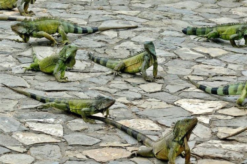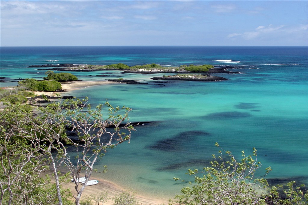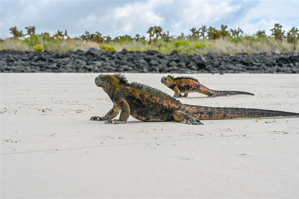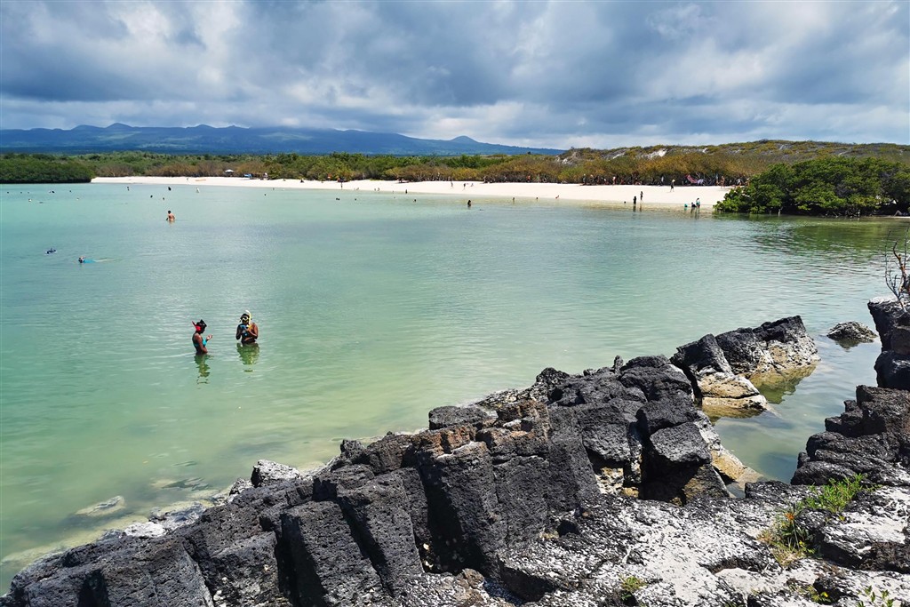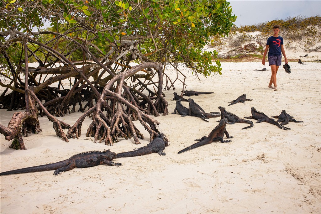 Tortuga Bay sa skladá z dvoch pláží: Playa Brava a Playa Manda. Playa Brava je pláž s obrovskými vlnami vhodná pre odvážnych surfistov, kde sú častými návštevníkmi žraloky. Tu sa nebudeme kúpať. Po nádhernej bielej pláži sa vydáme vpravo a asi 15 minút idú naše bosé nohy vo vode, topánky v ruke. Ideme stredom a nie hore na dunu. Tam totižto korytnačky kladú vajíčka. Tie miesta sú označené a je tam páska, ktorá hniezdo ohraničuje. Najväčšími nepriateľmi korytnačiek sú novo dovezené živočíchy ako mačky, prasce, ktoré korytnačie vajíčka nájdu a zjedia. Prídeme až k malému zelenému mangrovníkového lesíku pod ktorým sa vždy (čo sem 10 rokov chodíme) vyhrievajú morské leguány. Do vody chodia 2x za deň na 10 až 15 minút, ale je ich tu toľko, že šanca je značná. Uvidíte leguány vystrekovať soľ z nozdier. Všímajte si ich chvosty prispôsobené plávaniu. Naučíte sa rozlišovať samca s veľkými ostňami na chrbte a hlave od samičiek. Na bielučkom piesku sa čierne leguány vynímajú a budete mať ohromný zážitok. Potom sa vydajte ešte 3 minúty krížom a prídete k pokojnej lagúne na Playa Manda kde môžete kajakovať či si v bezpečí zaplávať, šnorchlovať v pokojnej vodičke. Často tu vidieť morské korytnačky či plávať raje a zvláštne vtáky, ktoré máme v CK radi- volajú sa Booby (čítaj Bubi - sula modronohá).