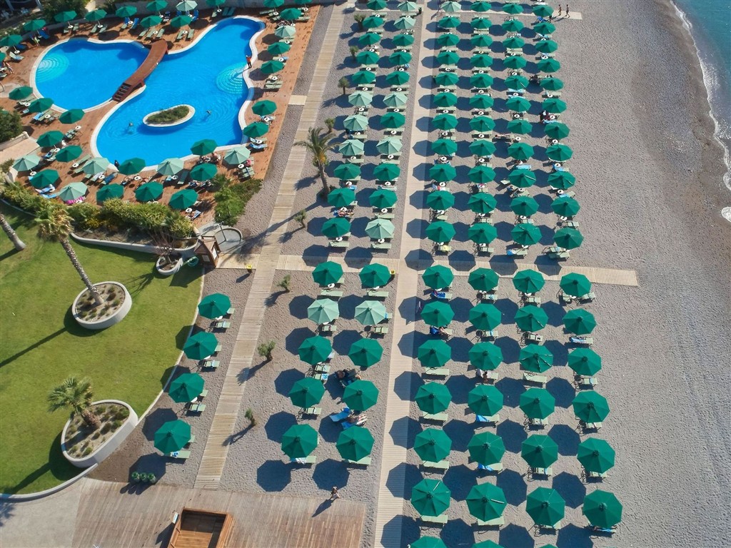 Piesočnato kamienková pláž priamo pri hoteli • ocenená Modrou vlajkou • pozvoľný vstup do mora • slnečníky, ležadlá a plážové uteráky (zdarma) • vodné športy (za poplatok)