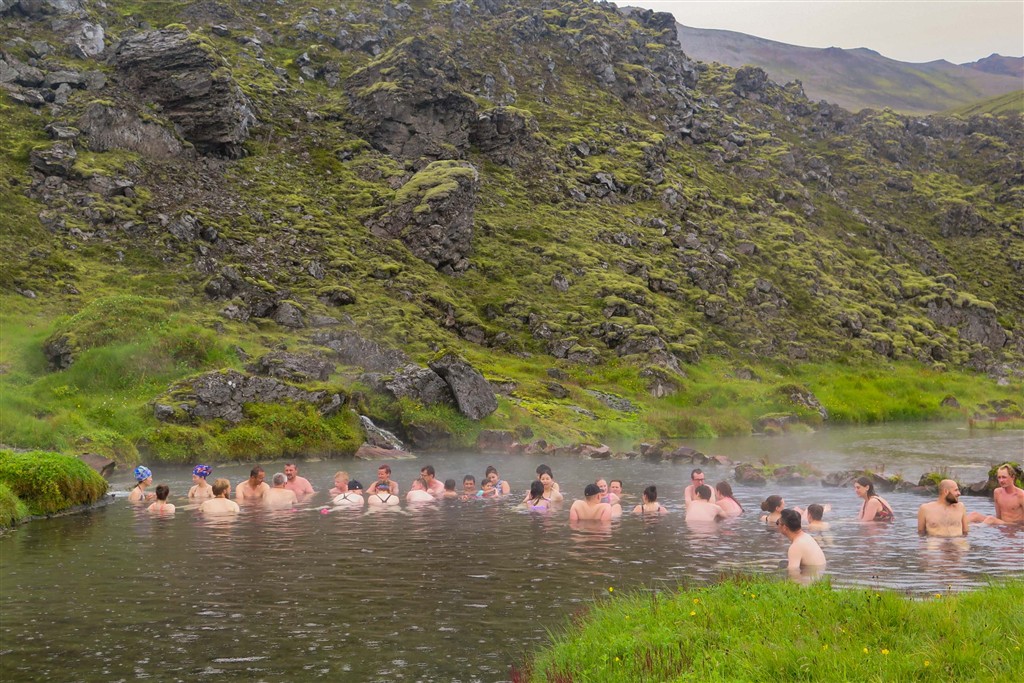 Čakajú nás slávne LANDMANNALAUGAR. Terénnym vozidlom smerujeme do vnútrozemia údolím ?jórsárdalur so zástavkou pri vodopáde HJALPARFOSS. Rieka Fossa sa tu krásne štiepi na bazaltových stĺpoch a padá do hĺbky 20 metrov. Kaňony, údolia, nespevnené prechody riek, polia čiernej lávy a na obzore majestátna sopka HEKLA, ktorú stredovekí Islanďania považovali za bránu do pekla. Jazero FROSTASTADAVATN obklopené farebnými horami a krátermi. Rímsa krátera LJOTIPOLLUR a jazero v kráteri, v ktorom žijú pstruhy. Okolo nás zrejme najpestrejšie a najfarebnejšie scenérie Islandu. Čas na túru (Laugahraun alebo Blahnukur) v očarujúcom prostredí. Pohodlnejší sa zatiaľ okúpu v prírodných horúcich prameňoch. Návrat do Reykjavíku večer s láskou k Islandu v srdci. (Tento výlet sa v termínoch od októbra do júna nekoná z dôvodu neprejazdných ciest a je nahradený iným výletom).