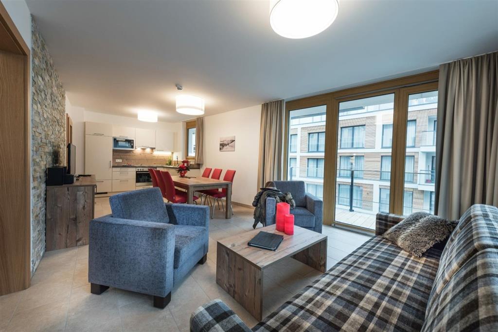 Apartmán o rozloze cca 76–92 m2 je určen pro 6–8 osob. Nabízí tři ložnice, vstupní halu s šatní skříní, dvě koupelny (sprcha) a balkon. Maximální kapacita: 6 dospělých a 2 děti do 15,99 let.