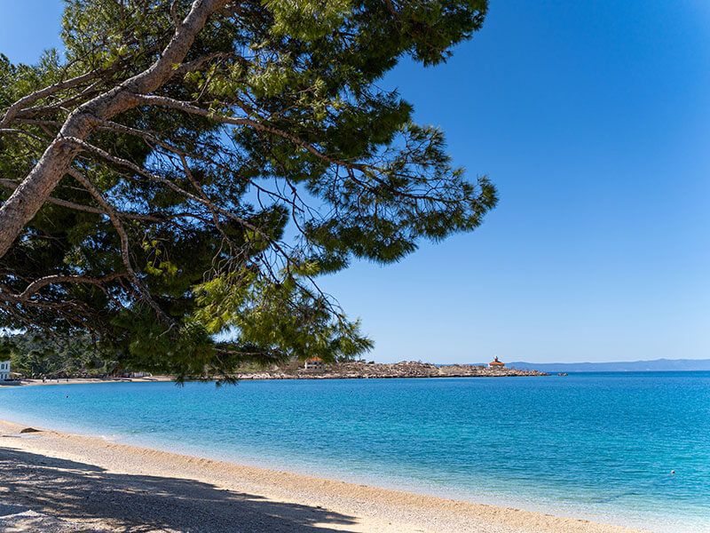 Přímo před hotelem leží 2 km dlouhá oblázková pláž s pozvolným vstupem do moře. Za poplatek si můžete na pláži vypůjčit lehátka a slunečníky. Široká nabídka vodních sportů zaručí zábavu dětem i dospělým. Na pláži jsou k dispozici placené sprchy. Promenáda kolem moře je lemována piniemi, hotely a restauracemi.