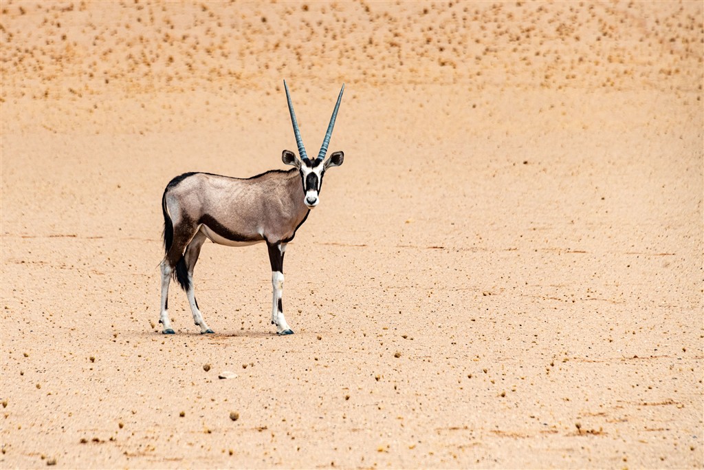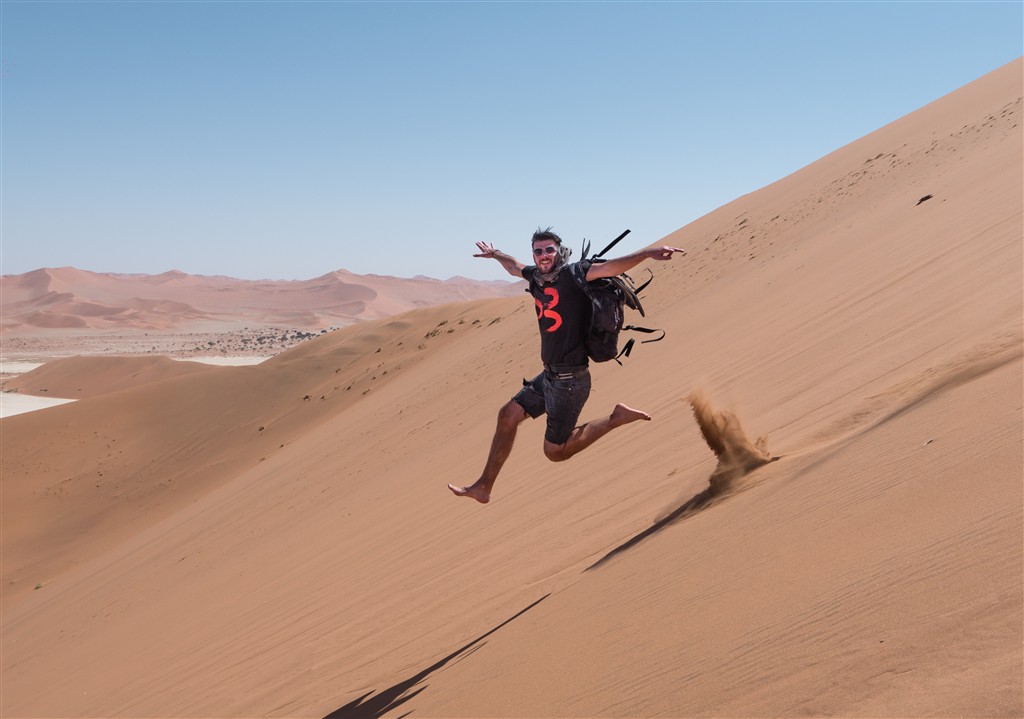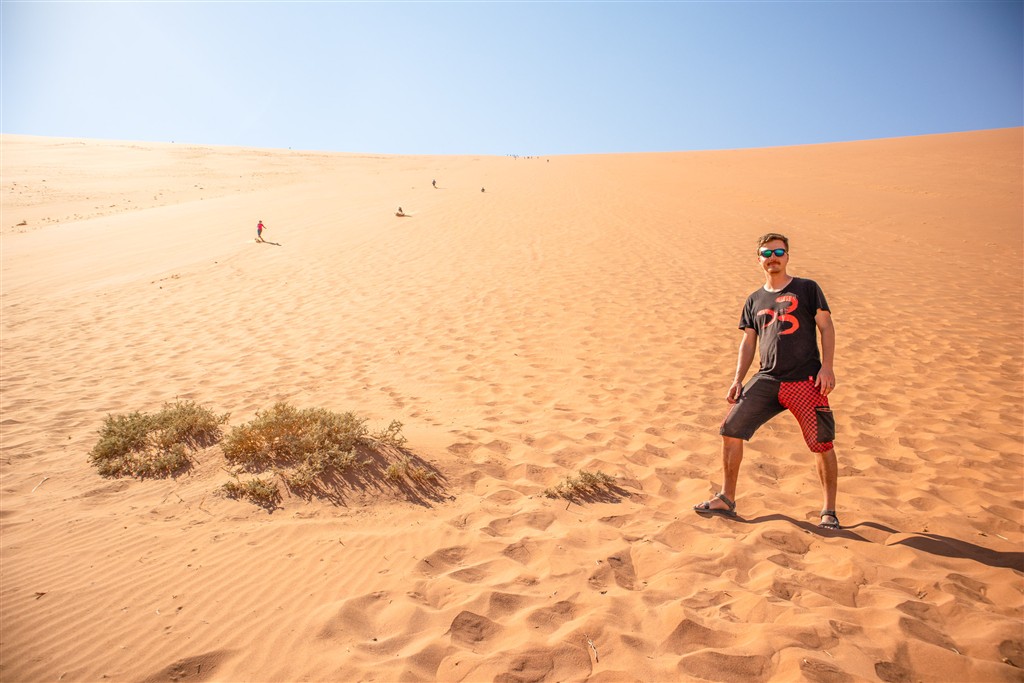 Skorý ranný budíček a my vyrážame na bránu parku. Otvárajú ju s východom slnka a tak nie je stanovený presný čas, hýbe sa počas roka. My však chceme byť medzi prvými vo vnútri parku. Vstúpime dnu a nastupujeme na asfaltovú cestu vedúcu naprieč širokým údolím medzi piesočnými dunami. Na 45. kilometri od brány sa nachádza chronicky známa Duna č. 45. Je jednou z tých, na ktoré je povolený výstup a práve na ňu chodí najviac ľudí. My sa preto pohneme ešte o kus ďalej, až na samotný koniec asfaltky. Po ceste budeme hľadať zvieratá, ktoré obývajú tento nehostinný kút sveta. Priamorožce, pštrosy a s trochou šťastia hyeny a šakaly.