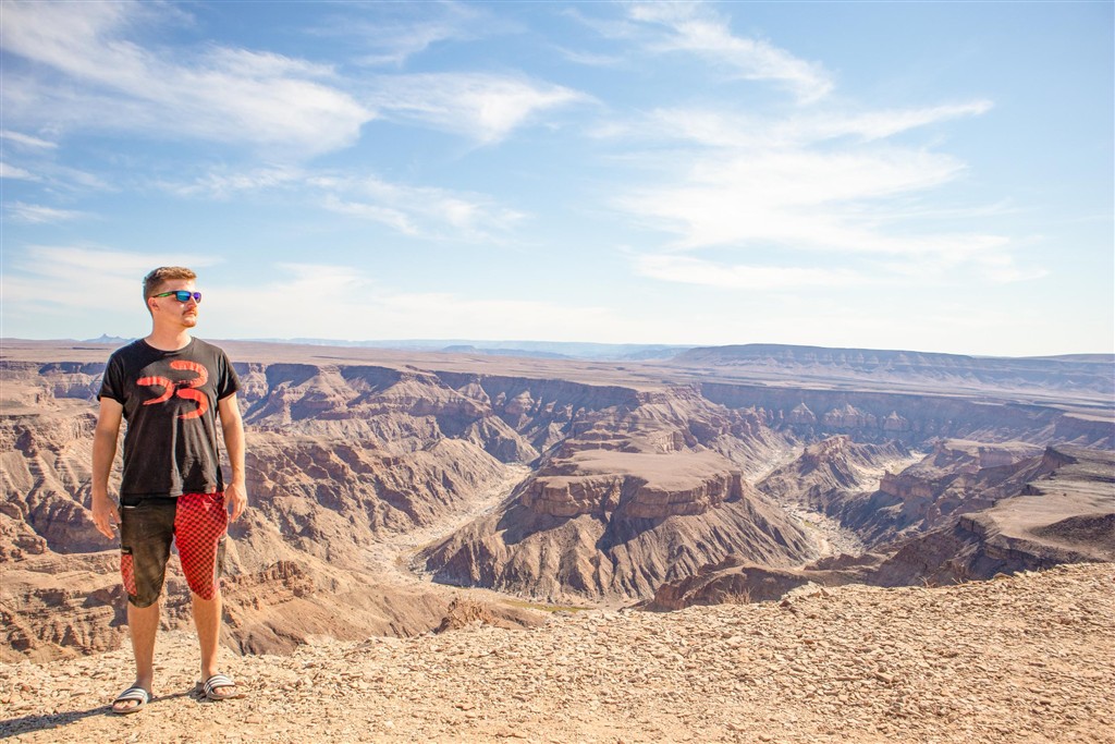 Raňajky a cez hraničný prechod Noordoewer vstupujeme do Namíbie. Namíbia je krajina, ktorá si príliv návštevníkov stráži a kontroly tu môžu byť zdĺhavejšie. Po tom, ako prekročíme hranicu sa vydáme po asfaltovej ceste naprieč regiónom Karas až po úroveň najväčšieho kaňonového systému v Afrike a jednom z najväčších na svete. Tu opustíme asfaltovú cestu a vstupujeme na prašné cesty. Dĺžka je 160 km, šírka 27 km a hĺbka v priemere 550 m. Hlavná časť, kontrolovaná správou národných parkov, sa tiahne od prameňov v Ais-Ais po vyhliadku Hobas. Tieto dva body sú od seba vzdialené 70 kilometrov. Zvyšok kaňonu (90 km) je v súkromnom vlastníctve. V kaňone je možné absolvovať trek. Povolenia sa vydávajú od mája do septembra a väčšinou sa čaká viac ako 2 roky. Trek má 88 km bez akejkoľvek infraštruktúry alebo chodníka. Všetko na 5 dní si v horúčave nesiete so sebou. Okrem tohto treku nie je možné zísť na dno, je možné sa iba kochať jedinečnými výhľadmi. Vyhliadka Hobas je považovaná za tú najkrajšiu a my tu strávime veľmi príjemný čas.