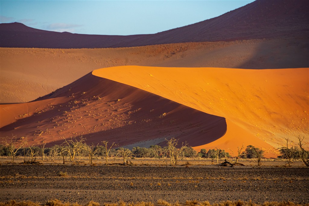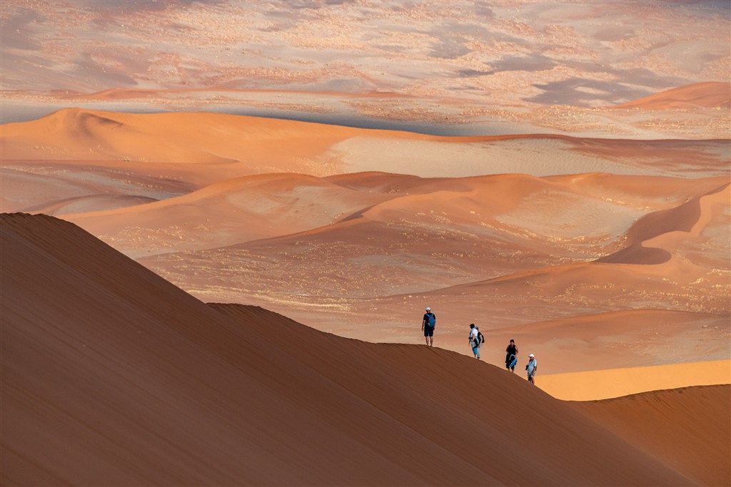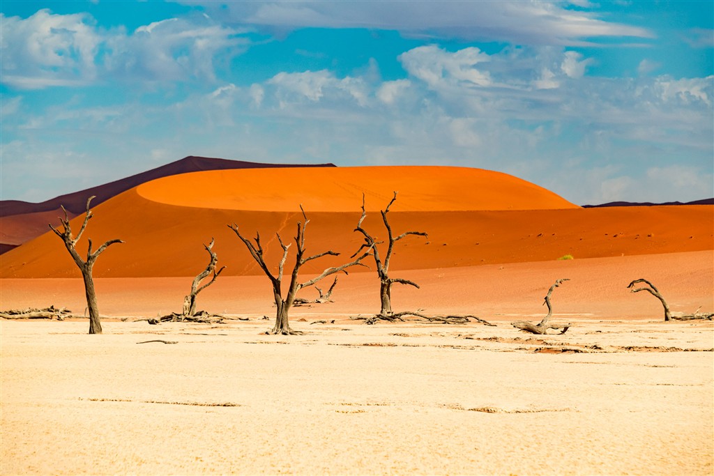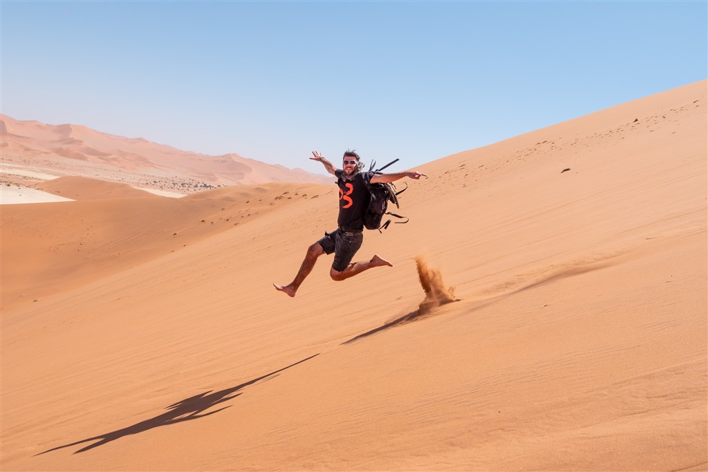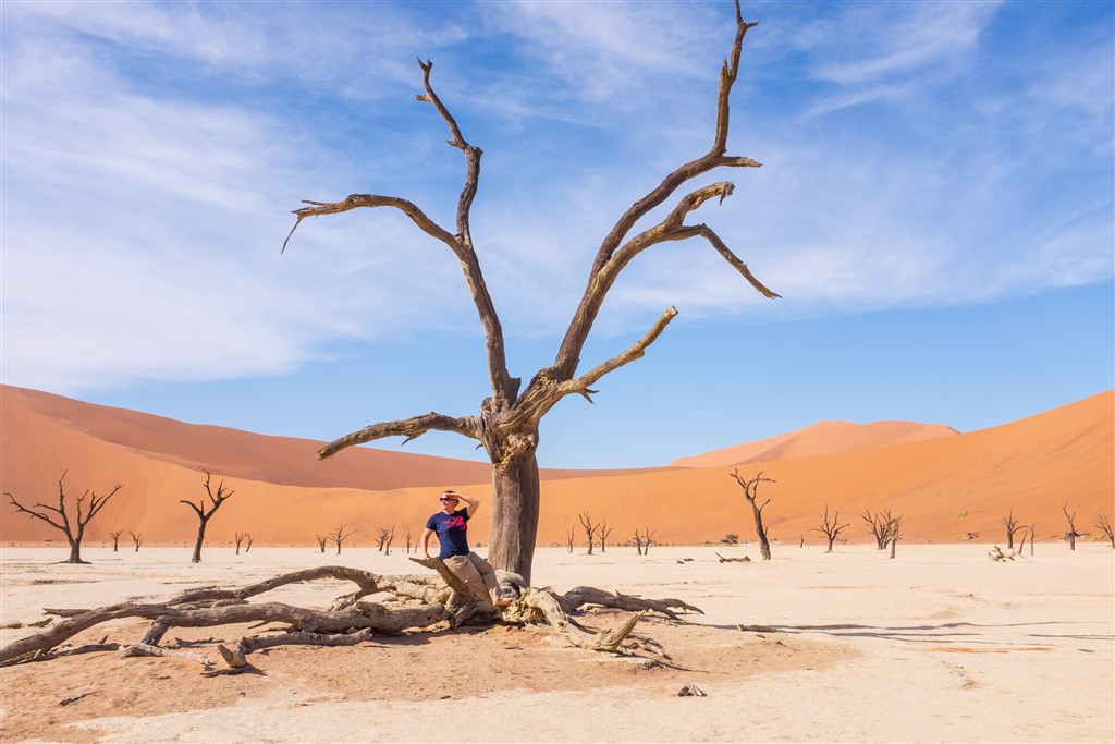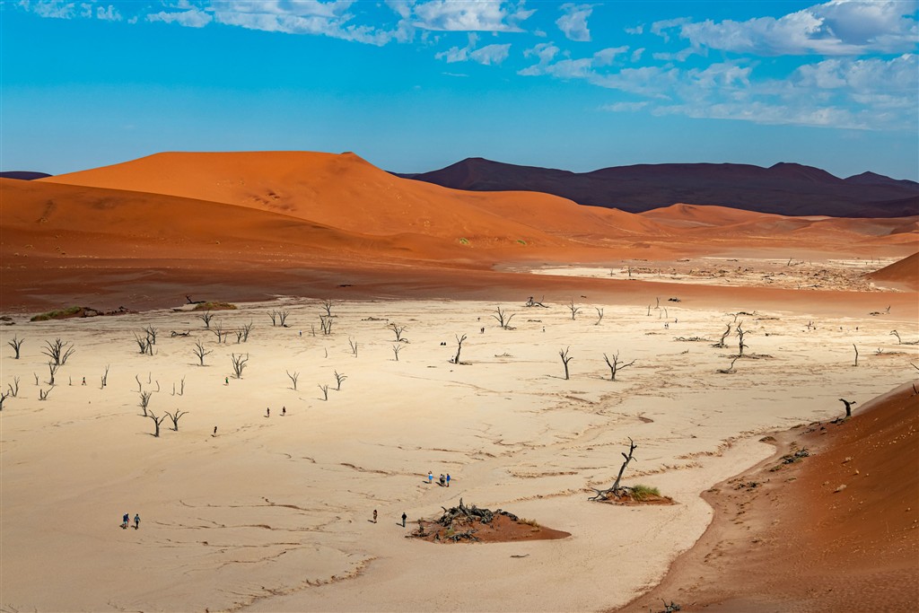 Budeme prechádzať aj pomedzi zaujímavé rastlinné útvary, ktorým sa hovorí „rozprávkové kruhy“. Nie je úplne zrejmý dôvod, prečo sa trávy správajú tak, že rastú v uzavretých kruhoch. Do roku 2014 boli známe iba miesta v tejto časti sveta, objavili sa však aj kruhy na západe Austrálie. Na konci asfaltu presadneme do terénnych áut a po piesku prejdeme niekoľko kilometrov. Vystúpime ešte pred údolím Sossusvlei. Prejdeme k nástupu na dunu a začneme stúpať. Piesok pod nohami nám bude „utekať“ a, doslova, spravíme dva kroky dopredu a jeden späť. Aj napriek tomu bude výsledok stáť za to. Väčšine našich klientov trvá tento výstup približne 50 minút až na vrchol jednej z najvyšších dún v okolí, Big Daddy. Výška od základne je približne 260-280 metrov. Z vrcholu duny sa nám naskytne neuveriteľný pohľad na prírodnú pamiatku UNESCO – Piesočné more púšte Namib. Veríme, že tu budeme sami. Keď budeme mať dostatok fotografií, začneme rýchly zostup priamo dolu, do Deadvlei (Mŕtveho údolia).