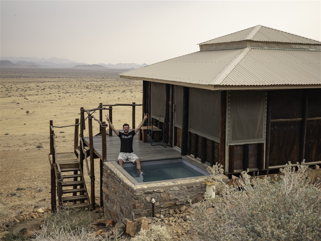 Po raňajkách si trošku užijeme miestnu krajinu. Sme neďaleko Fish River kaňonu a naokolo žiadne významné mestá. Sme niekde na pol ceste medzi mestom Keetmanshoop a Luderitz. Všade naokolo sú len farmy na dobytok alebo divinu a usadlostí je tu ako šafranu. Na jednej z takýchto fariem sme sa práve zobudili. Rozhliadnete sa okolo seba a máte pocit jedinečnosti. Oblasť Karas vymeníme za Hardap a postupujeme na sever. Vyprahnutá krajina ubieha a pozvoľna sa mení, v diaľke sledujeme množstvo stolových hôr, ktoré sa nám vynárajú na obzore. Na území Namíbie sa nachádza aj niekoľko známych skalnatých kopcov so zarezaným koncom - napríklad Etjo (500m) s dĺžou 10 km alebo Grutberg (1840m), Waterberg a Gamsberg. Stolové hory dostali svoje zvláštne mená od prvých nemeckých objaviteľov. My sme tú najznámejšiu Stolovú horu už spoločne zdolali v Kapskom Meste.