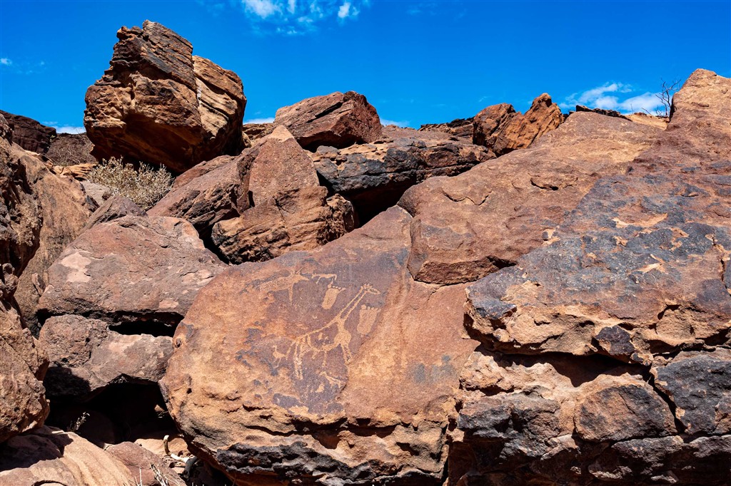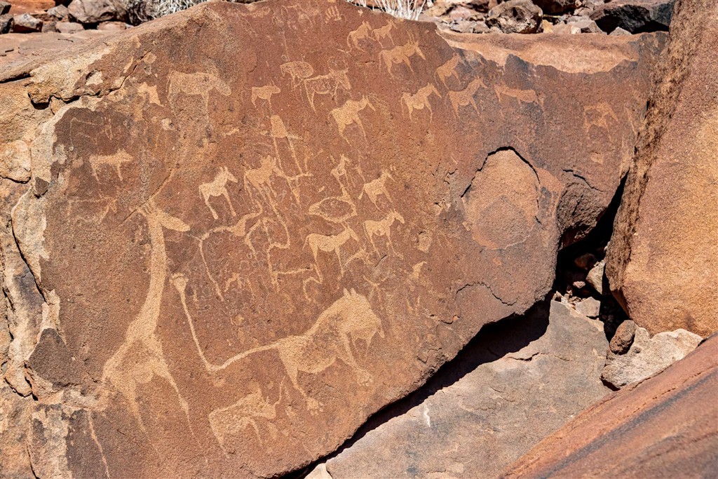 Vstupujeme do krajiny známej ako Damaraland, pomenovanej po jednom zo sanských kmeňov. So šťastím nám tu ráno prebehnú cez cestu surikaty známe z kalaharskej oblasti. Na ceste sa objavuje dopravná značka „pozor, slony“. Práve tu sa podľa ročného obdobia pohybujú rodiny púštnych slonov. Žije ich už iba posledných niekoľko sto jedincov a nájdete ich v Damaralande a Kaokolande v Namíbii a v južnej Angole, kde však boli zväčša vystrieľané. S dávkou šťastia ich zazrieme, poprípade zvyšky po ich hodovaní. Prechádzame krajinou so skalami akoby naváľanými od obrov. Krajina je neuveriteľne fotogenická. Tesne pred príchodom do oblasti Twyfelfontein sa nachádza múzeum pod otvorenou oblohou Damarov. Je to obdoba našich skanzenov. Tu sa dozviete niečo o živote krovákov. Uvidíte, ako bývajú, čo jedia, aké liečivé rastliny používajú a ako sa bavia tancom a spevom. Zahráte si s nimi hru, ktorá riešila aj medzidedinské spory?