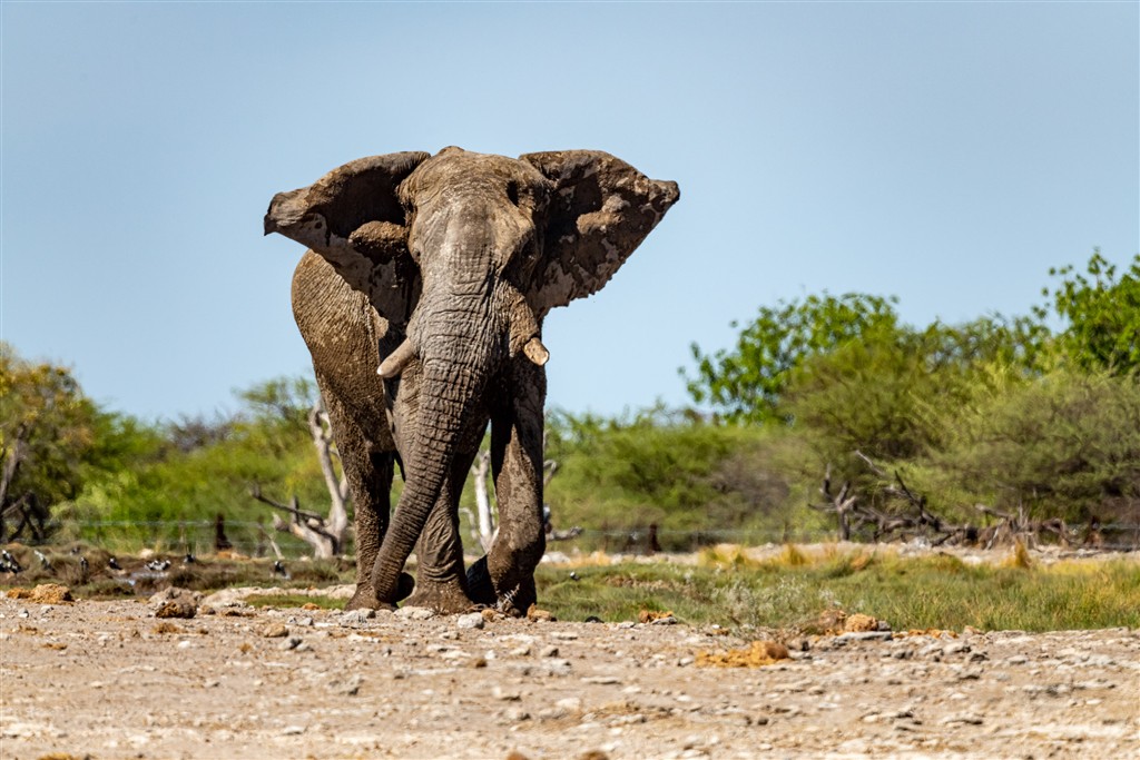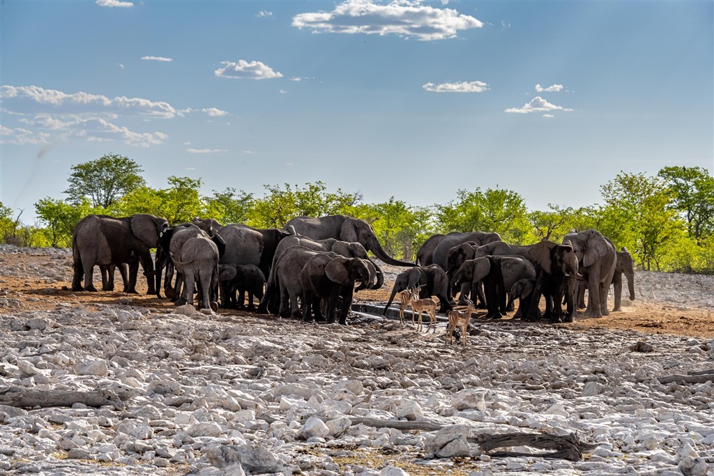 Jazero postupne vysychá a mení svoju farbu. Z hnedo-červenej, cez zelenú, až do čisto bielej, keď nadobro vyschne. Cesty sú výborne značené, informácie o pohybe atraktívnych živočíchoch dostanete v každom z troch kempov. Všetko záleží už len od vašich očí a dávky šťastia. Obrovským lákadlom sú slony. Je to najvýchodnejšia časť populácie púštnych slonov, ktoré sú najväčšie. Ak budete mať šťastie, uvidíte mohutné samce obalených bielym bahnom. Keď si ich o niekoľko dní porovnáte so slonmi v Chobe, uvidíte rozdiel vo veľkosti.