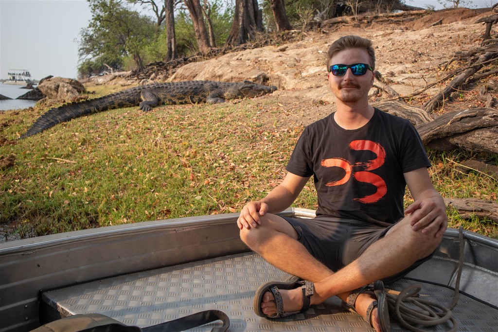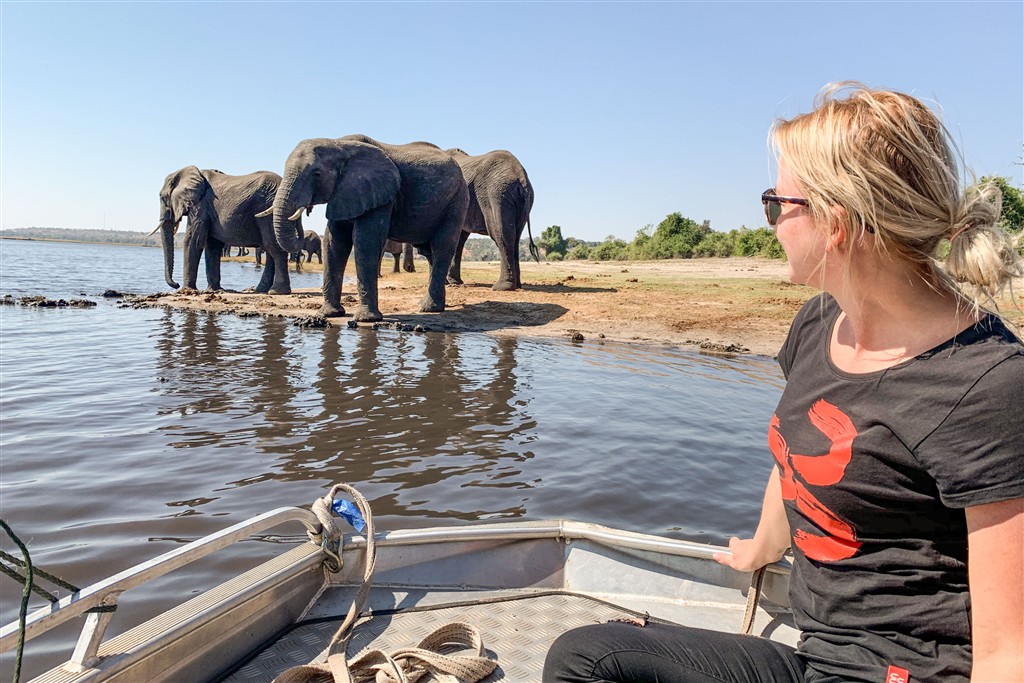 Dnes nás čaká dopoludňajšie safari v Chobe. Vyrazíme skoro ráno. Chobe je úplne iný typ parku ako Etosha. Je menej známy, ale životom prekypujúci park. Najčastejší spôsob návštevy tohto parku je vozenie sa po brehu rovnomennej rieky. Môžete si zvoliť z dvoch spôsobov. Buď tradičnou cestou autom, alebo z lode, čo sme absolvovali už prvý deň po príchode do Kasane. Auto vám umožní vidieť breh rieky a takisto aj buš a les ďalej od vody. Najlepšie je obdobie sucha (od mája), kedy sa zvieratá sťahujú k rieke, keďže park nemá dostatok napájadiel. Cesta vodného safari je ďalšou možnosťou. Zver je na prítomnosť lodí zvyknutá a nemajú problém, ak zakotvíte tesne pri nich. Takto si môžete vychutnať pohľad na pijúce, alebo kŕmiace sa slony, rôzne druhy antilop, vrátane vzácnych a plachých hrivnatcov čiernych a antilop konských. Vodárka lečve je tu bežná, takisto ako hrochy a krokodíly. Týchto si máte možnosť z lode pozrieť z minimálnej vzdialenosti. V parku žijú všetky zvieratá, ktoré sa bežne na safari dajú vidieť, okrem nosorožcov. Tých, bohužiaľ, pytliaci vybili a zvyšných päť bolo presťahovaných na neďalekú záchrannú stanicu. Zaujímavé je mestečko Kasane, ktoré bezprostredne susedí s parkom. Cez deň sa po uliciach potulujú rodinky prasiat bradavičnatých a v noci je možné stretnúť byvoly alebo slony krátiace si cestu cez mestečko k pastve na brehu rieky Chobe.