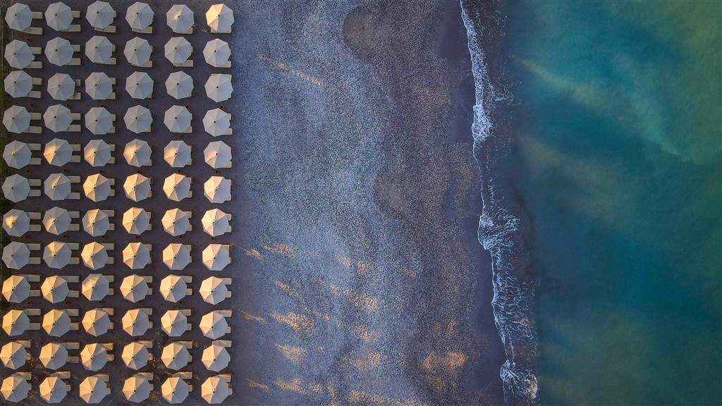 Piesočnatá pláž s kamienkami s pozvoľným vstupom do mora priamo pri hoteli, mólo, plážový bar, ležadlá, slnečníky a osušky zdarma.