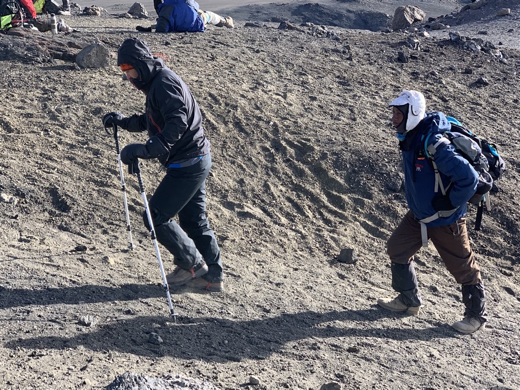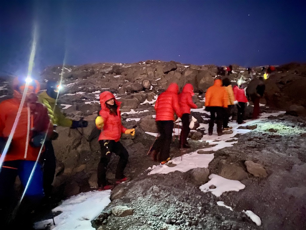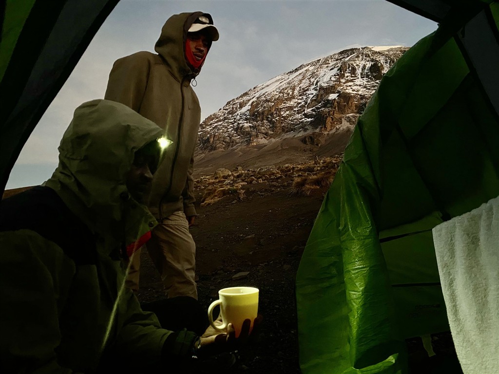 Výstup začína veľmi skoro, okolo polnoci, nakoľko dnešný trek bude trvať 10-14 hodín. Taktiež sa vyhneme hmle, ktorá zahaľuje vrchol v neskorších doobedňajších hodinách a sneh bude ešte zmrznutý a tak sa ide lepšie. Obrovským trikom CK je tzv. 1+1 čiže na jedného klienta platíme jedného horského vodcu. Toto je ďalšia drobná časť do skladačky „úspešný výstup na Kilimandžáro.“ Nie všetky triky prezradíme =)