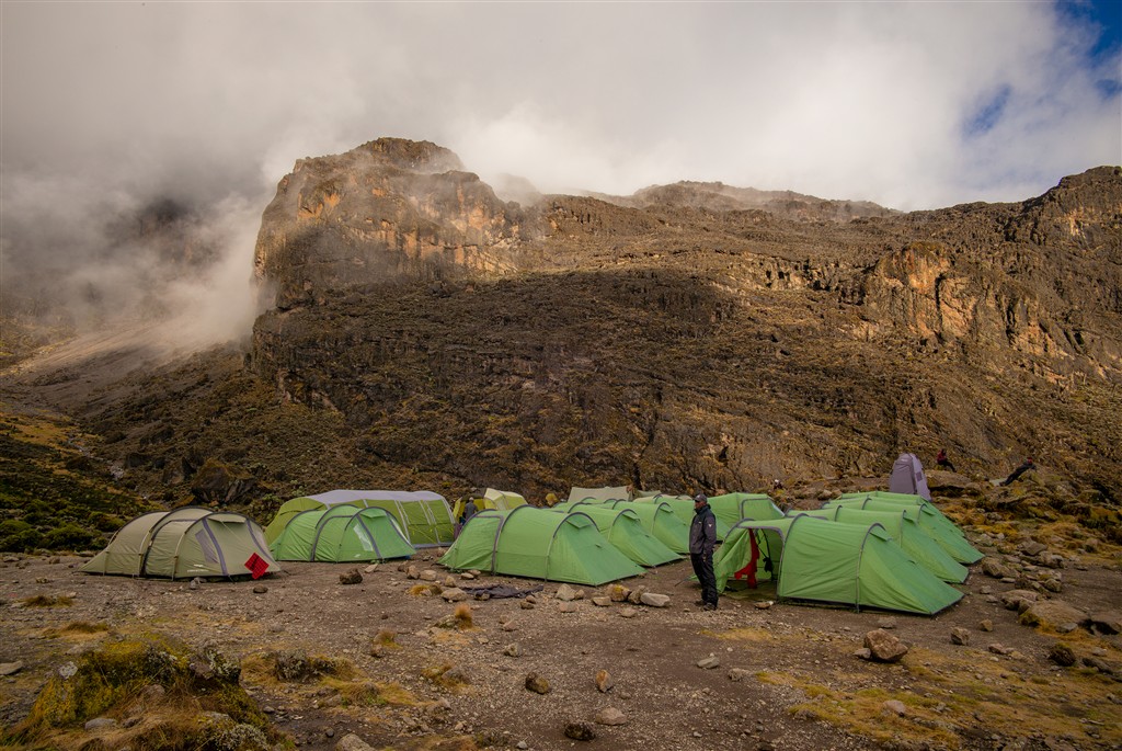 Budíme sa v prenádhernom prostredí kempu. Na jednej strane hlboké údolie s nedozernou savanou a rannými svetielkami z mestečka Moshi, na druhej strane vysokánska stena Baranco. Všade lobelie (Lobelia deckenii) a nádherné „palmové lesy“ Stromových starčekov (Dendrosenecio Kilimanjari), z ktorých niektoré majú až 500 rokov a sú vysoké až 6 metrov. Dámy si môžu namaľovať pery červeným rúžom, budeme totižto stúpať okolo Kissing stone, skaly, ktorá trčí do cesty a vy, keď prechádzate okolo, ju musíte poriadne oblapiť. Naše dámy tu môžu nechať odtlačok svojich pier, ktorý určite povzbudí ďalších trekerov. Do kempu Karanga zostúpime okolo obeda a naši kuchári nás vítajú čerstvým avokádovým šalátom. Avokáda natrhali včera ráno v úrodnom podhorí Kilimandžára a čerstvé jedlo nám vyniesli až sem hore do výšky 4035 m. Už sme spali v 4200, obedovali v 4600 m, a tak výška 4035 m je pre nás nízka, prijateľná. S čerstvou stravou a nádherným výhľadom na Kibo nám energia prúdi do žíl a my sme opäť sami sebou. Kemp Karanga mnohí vypustia, aby ušetrili deň za ktorý sa platí poplatok národnému parku- no to je opäť veľká chyba. My ju neurobíme a pred výstupom do Base campu si poriadne oddýchneme a naberieme sily.