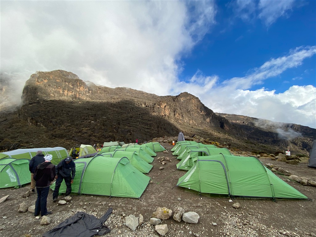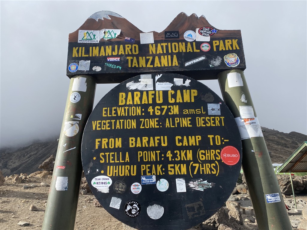 Z kempu v Karanga Valley odchádzame, aby sme sa napojili na chodník Mweka Trail. Týmto sme ukončili Južný okruh, ktorý poskytuje rôzne pohľady na vrchol. Ani jeden deň nebol rovnaký. Zložíme sa v Barafu kempe, tu stretávame ostatných trekerov, kde väčšina chodí po okolí ako mátohy. My sa smejeme a tešíme sa. Na obed máme karbohydráty, skontrolujeme si vrcholovú výstroj, kyslíkové bomby a ideme si na chvíľu ľahnúť, aby sme boli pripravení na záverečný výstup. Z tohto miesta je možné vidieť dva vrcholy Kilimandžára - Mawenzi a Kibo a tak fotíme a fotíme.
