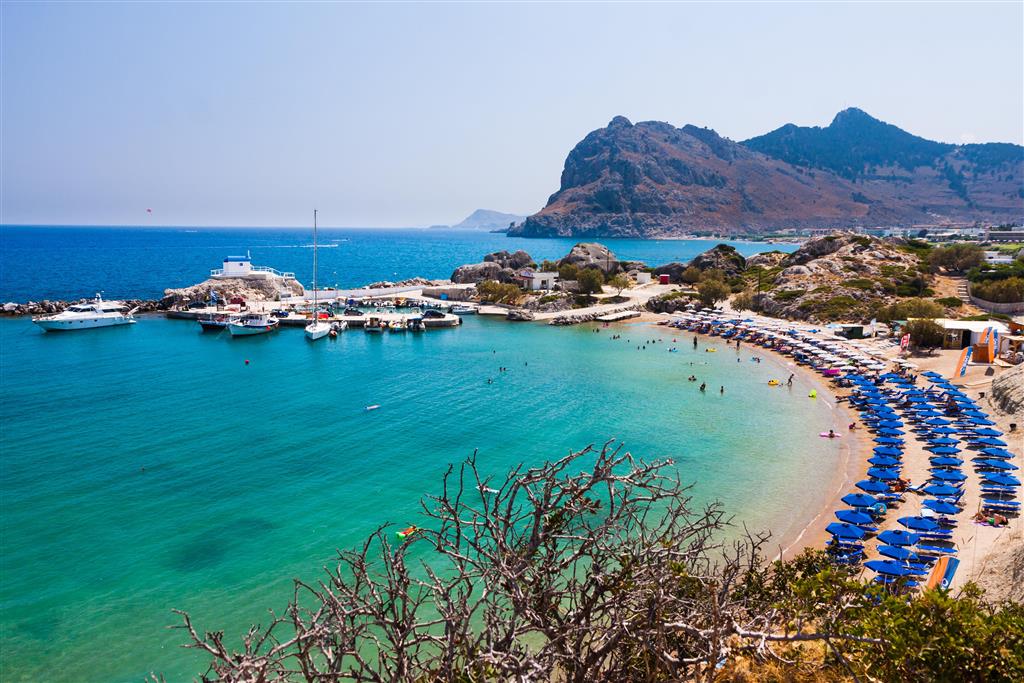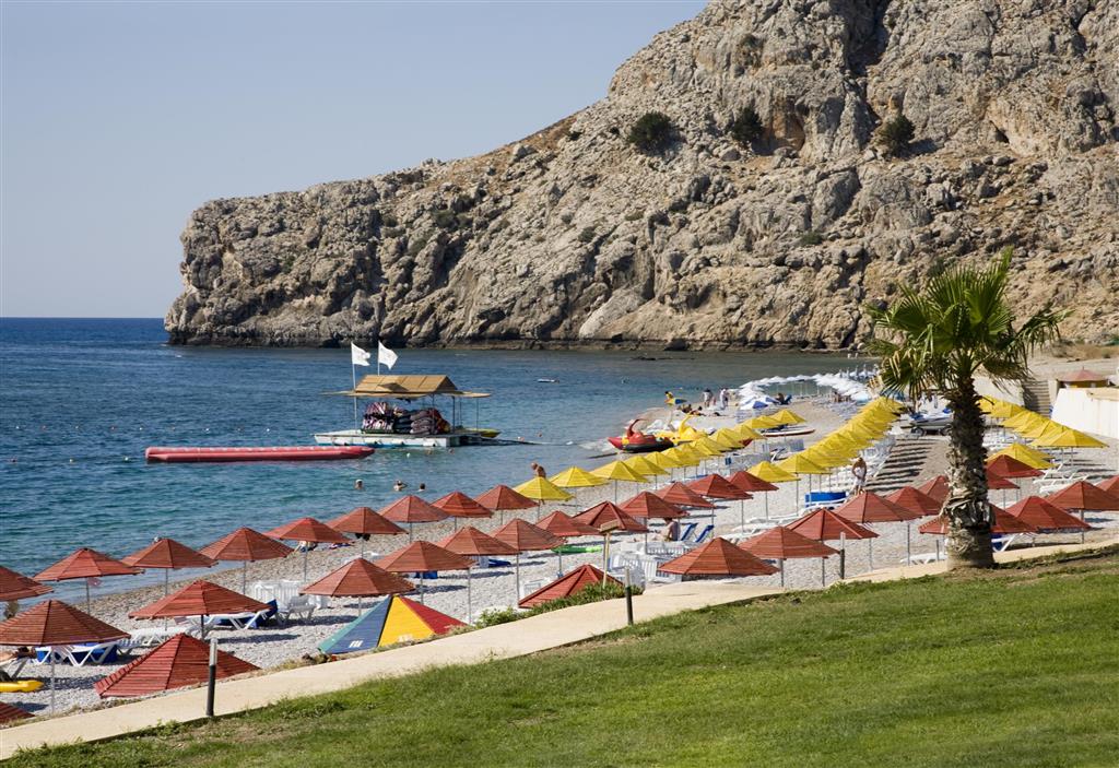 juhovýchodne od mesta Rodos v krásnom zálive so štrkovo-piesočnatou plážou,