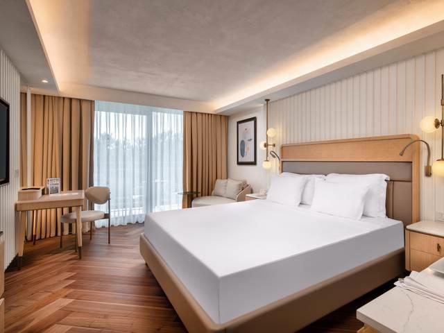 deluxe izby s výhľadom na bazén alebo s bočným výhľadom na more: 38-40 m2, max pre 2+2 alebo 3 osoby