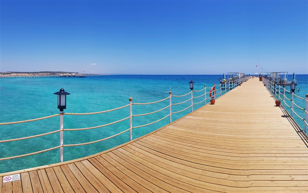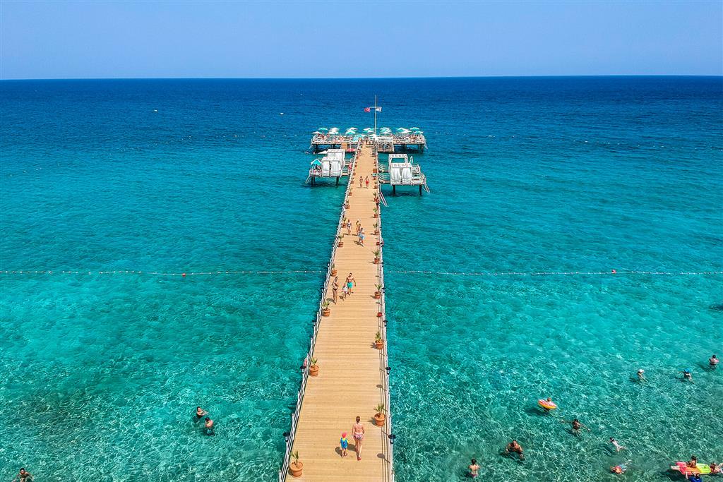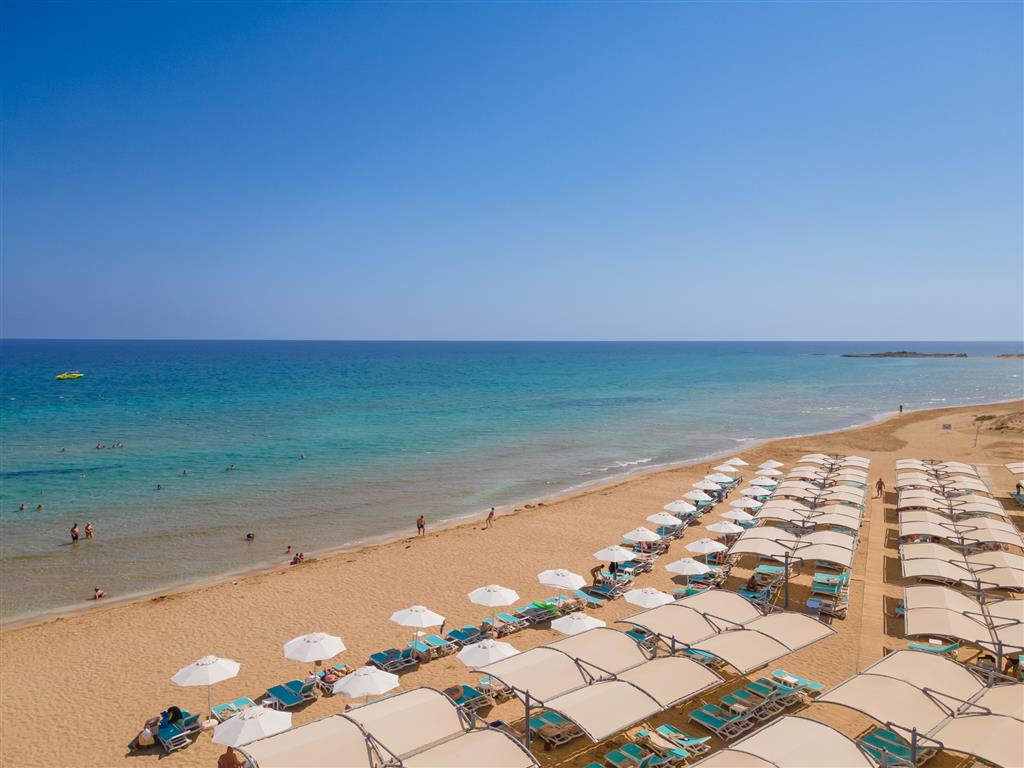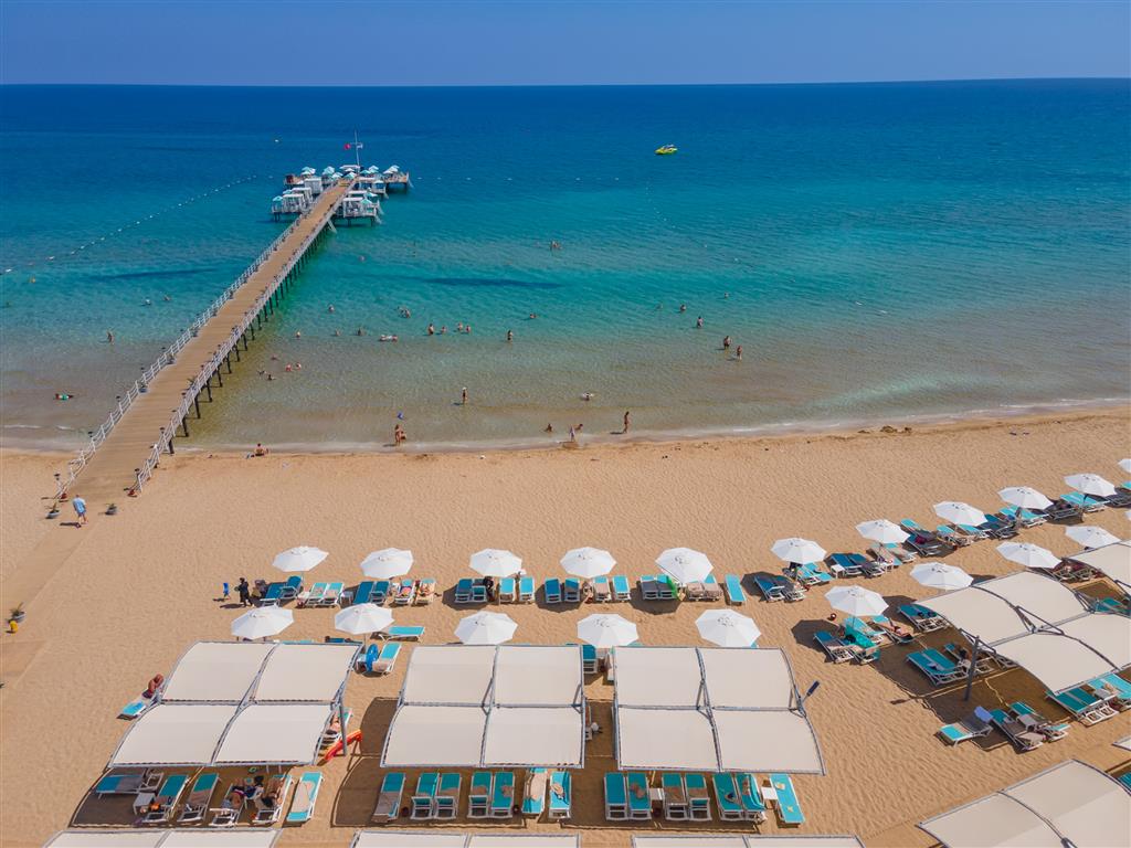 hotelová široká pláž s jemným pieskom aj v mori • pozvoľný vstup do mora • slnečníky a ležadlá (zdarma) • cabany (za poplatok) • plážové osušky (zdarma) • vodné športy (za poplatok) • 170 metrov dlhé mólo • plážový bar