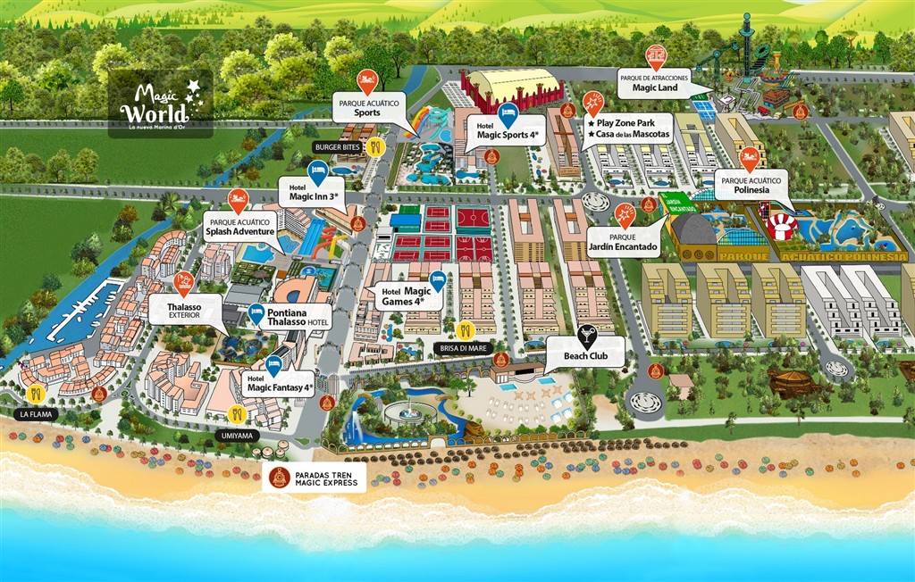 Priamo v srdci Magic World Resortu, v blízkosti obchodov, reštaurácií a barov. Pobrežná promenáda spájajúca Magic World Resort s letoviskom Oropesa del Mar cca 300 m. Centrum letoviska Oropesa del Mar cca 3 km. Vzdialenosť letiska Castellon cca 30 km.