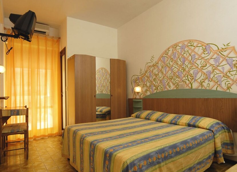 pokoj s manželskou postelí, případně s jednou až dvěma přistýlkami nebo patrovou postelí, hlavní budova, 4. a 5. patro, balkon, výhled na moře, panoramatický výhled, klimatizace v ceně, TV, Wi-Fi na pokoji, trezor, telefon, lednice, sprcha, (sprchový kout), bidet, fén, parkovací místo, na parkovišti u hotelu nebo na vzdálenějším parkovišti cca 30 m od hotelu, parkovací místo, v garáži, na vyžádání, 8 €/den, kryté, nástupní dny kdykoli, min. pobyt standardně 3 noci, kratší pobyt na vyžádání a za příplatek v cestovní kanceláři 240 Kč/osobu/den, příjezd od 13:00 do 21:00, odjezd od 08:00 do 10:00 hod., pozdější odjezd za poplatek 50 €