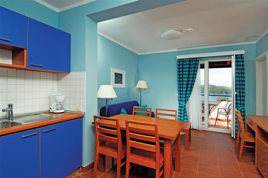 klimatizované apartmány majú zariadený kuchynský kútik (varná doska, rúra, kávovar, chladnička) • sprcha/WC • fén • LCD SAT TV • telefón • trezor • Wi-Fi pripojenie • všetky apartmány balkón/ loggiu resp. terasu