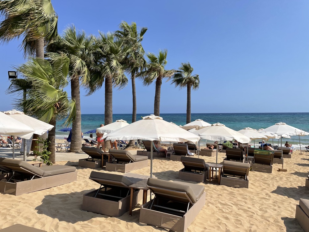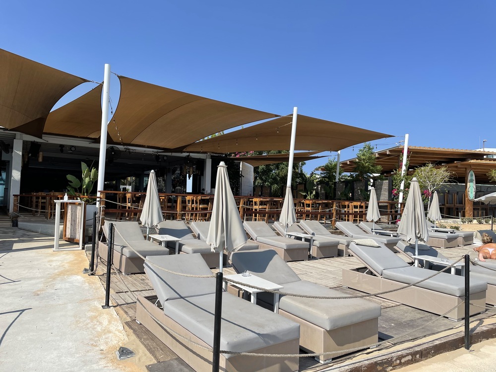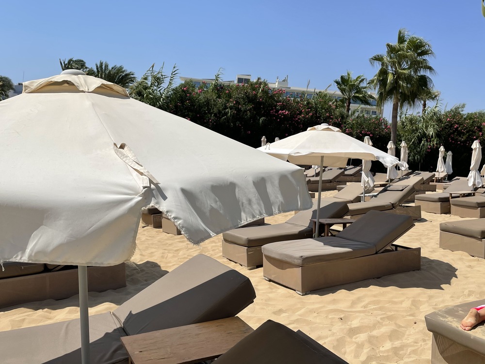 piesočnatá pláž s pozvoľným vstum do mora, ležadlá a slnečníky na pláži (zdarma, obmedzená kapacita), plážový bar Skifos (nápoje zdarma)