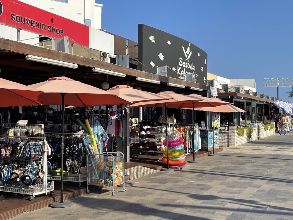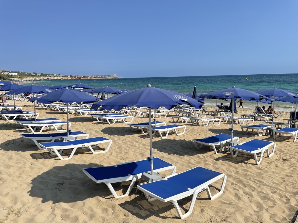 piesočnatá pláž s pozvoľným vstupom do mora, ležadlá a slnečníky na pláži (zdarma, obmedzená kapacita), plážový bar Skifos (nápoje zdarma)