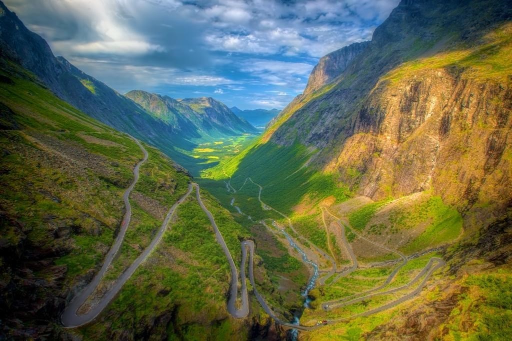 Rozsiahlym údolím Gudbrandsdalen sa cez mestečko Dombas dostaneme až do údolia Romsdal. Pozdĺž divokej rieky Rauma to už nie je ďaleko k najväčšej kolmej stene Európy, Trollveggen (Trolia stena). Vychutnáme si jazdu po slávnej Veľkej ceste trollov (Trollstigen) stúpaním po 11 serpentínach. Na vrchole si z vyhliadky ešte raz pozrieme všetky zákruty, okolitú prírodu a vodopád. Zlatou cestou severu sa dostaneme až k 15 km dlhému fjordu Geiranger (UNESCO), ktorý je údajne jedným z najkrajších v krajine. Plavba trajektom cez celý fjord nás v tom utvrdí. Uchváti nás nielen okolitá príroda, ale aj vodopády s názvom Sedem sestier.