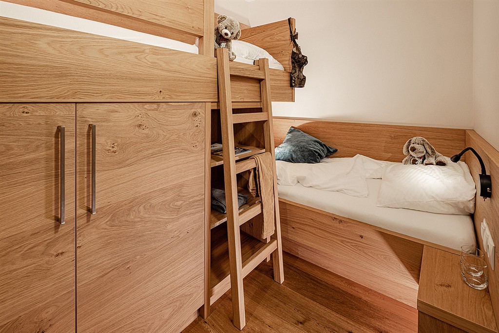 Suite Huberhof 2/3/4/5/6: 58 m2 - izba s manželskou posteľou a rozkladacím gaučom, priestranná rodinná izba s oddelenou časťou na spanie pre deti do 14 rokov s poschodovou posteľou, sociálne zariadenie, balkón s výhľadom na juh