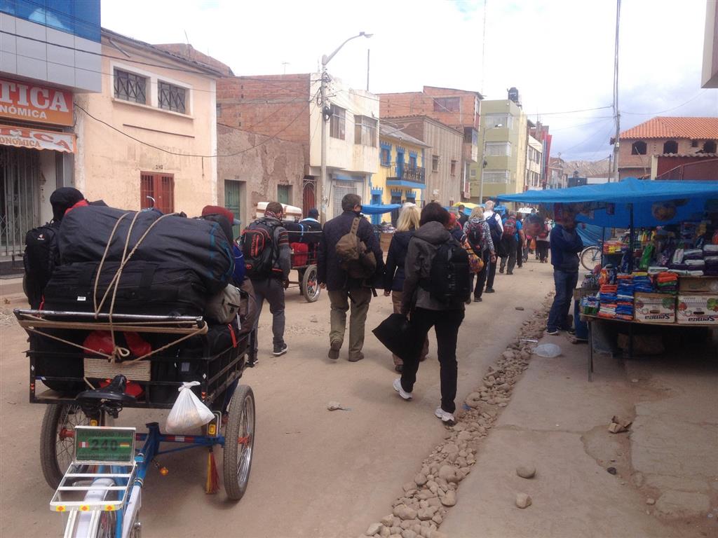 Okolo najvyššie položeného splavného jazera sveta sa pomaly presúvame k hraničnému prechodu v mestečku Desaguadero, podľa rieky, ktorá tvorí hranicu a zároveň je to jediný odtok z jazera. Vystupujeme, s batožinou nám pomôžu miestni mládenci na špeciálne upravených nákladných bicykloch, ktorí nám kufre s úsmevom prenesú na druhú stranu (za pár soles, samozrejme). Soles zamieňame za bolivianos a ideme vyriešiť administratívne veci. Niekedy sme tu čakali niekoľko hodín, teraz to ide rýchlejšie. Vaši známi pravdepodobne ani netušia, kde sa táto krajina nachádza, Vy ste práve vstúpili na jej územie.