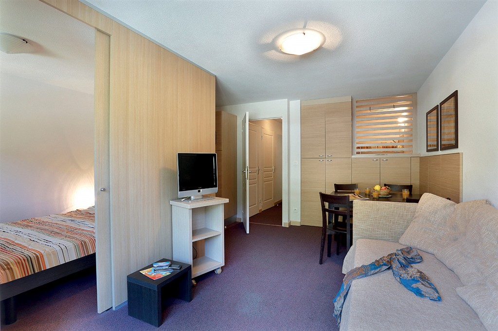 studio 4: 30 m2 - obývacia izba s kuchynským kútom a rozkladacím gaučom pre 2 osoby (možný aj typ "zásuvka"), kabína alebo vstupná miestnosť s 2 samostatnými lôžkami, sociálne zariadenie s vaňou, spravidla balkón alebo terasa
