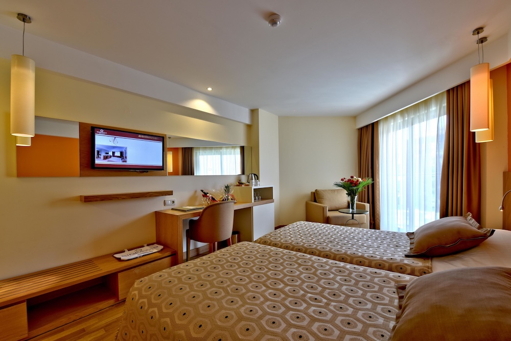 TV/SAT, telefón, WiFi, klimatizácia a trezor (zdarma), minichladnička, kanvica, vlastné sociálne zariadenie, sušič na vlasy, balkón