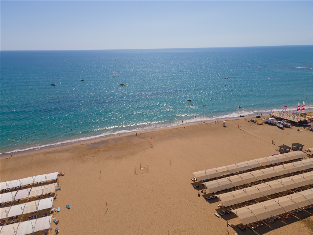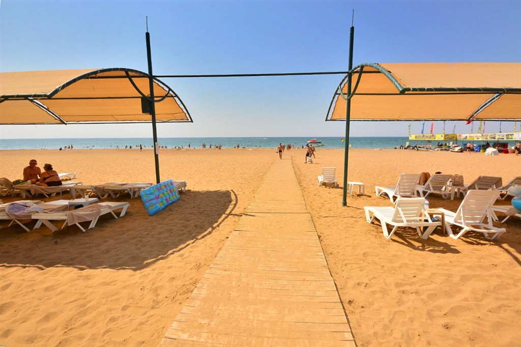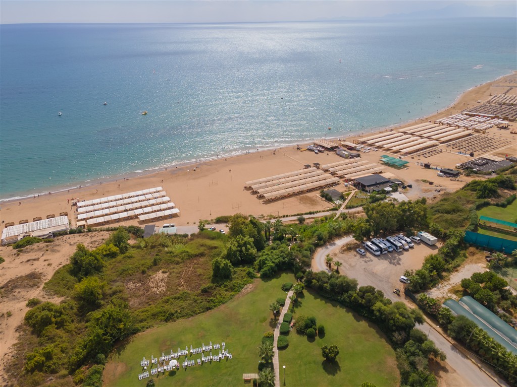 piesočnatá pláž cca 200m od recepcie hotela, dostupná cestičkou cez areál alebo hotelovým mikrobusom • ležadlá, slnečníky a osušky zdarma • vodné športy (za poplatok) • bar na pláži
