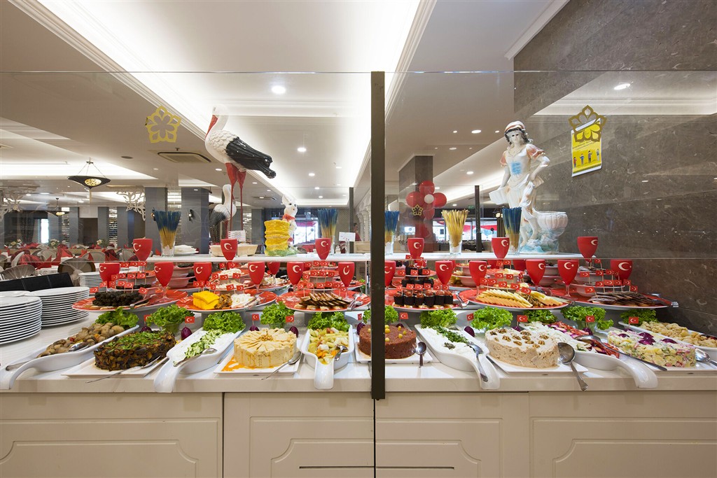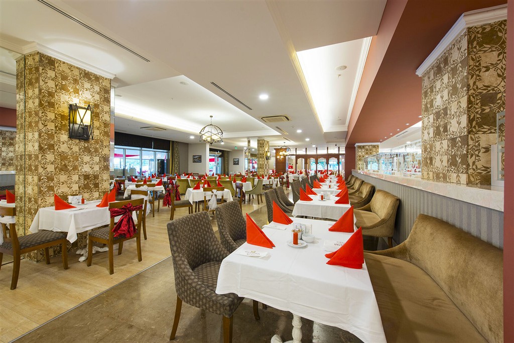 Hlavná reštaurácia (otvorený bufet - raňajky, obedy, večere) • A LA CARTE reštaurácie: mexická • ázijská • turecká • Bary: Lalezar • Disco Bar • Pool Bar • Beach Bar • Bistro Bar