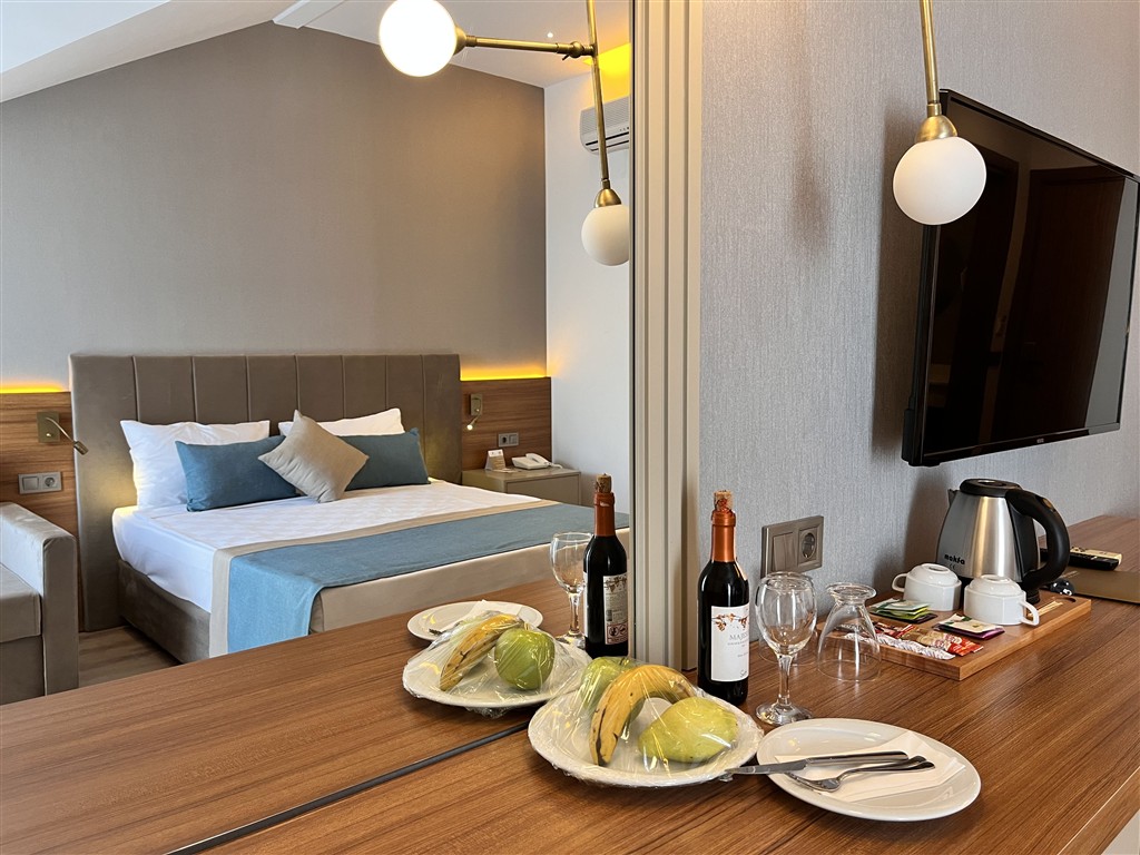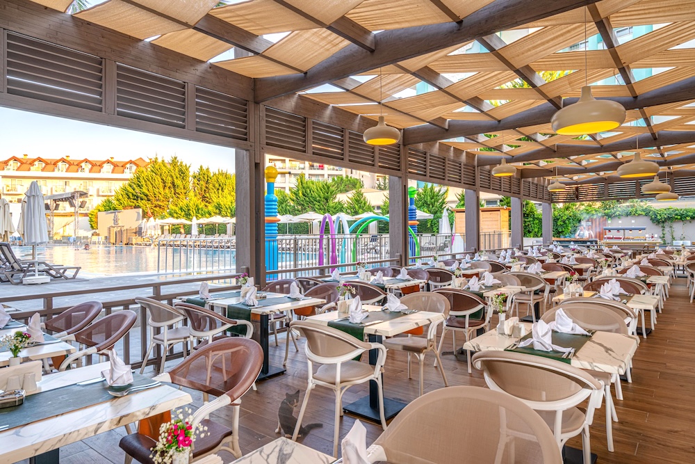 ultra all inclusive, raňajky, obedy a večere formou bufetových stolov, neskoré raňajky, alkoholické a nealkoholické nápoje miestnej výroby, pivo, víno, popoludňajšie občerstvenie, cukráreň, zmrzlina, gözleme (turecka "pizza"), nočný bufet, bezlepková a bezlaktózová straba (na vyžiadanie), 1x za pobyt večera v jednej z "á la carte" reštaurácii podľa dostupnosti zdarma (nutná rezervácia), Služby ultra all inclusive, otváracie časy a prevádzka stravovacích služieb môžu počas sezóny podliehať menším zmenám.