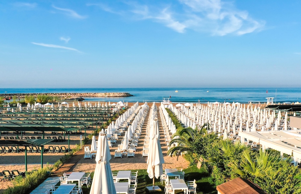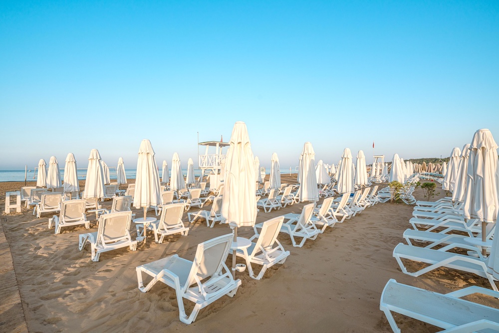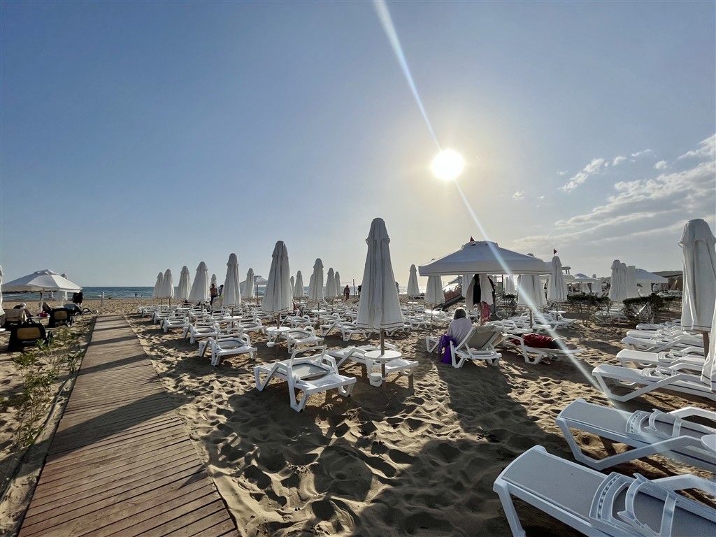 priestranná, piesočnatá pláž s príjemným pozvoľným vstupom do vody, vhodná pre deti aj neplavcov, ležadlá a slnečníky na pláži (zdarma), all inclusive bar na pláži