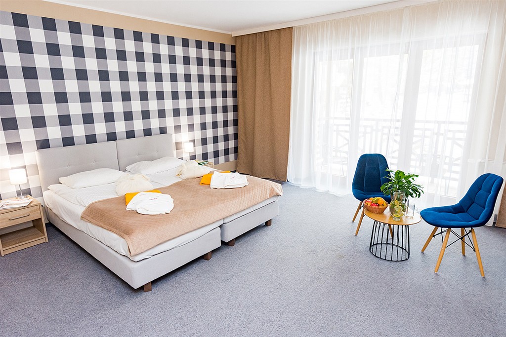 Deluxe 2/3/4: 25-30 m2 – izba s 2 samostatnými lôžkami, rozkladacím gaučom pre 2 osoby, sociálne zariadenie so sprchou, balkón