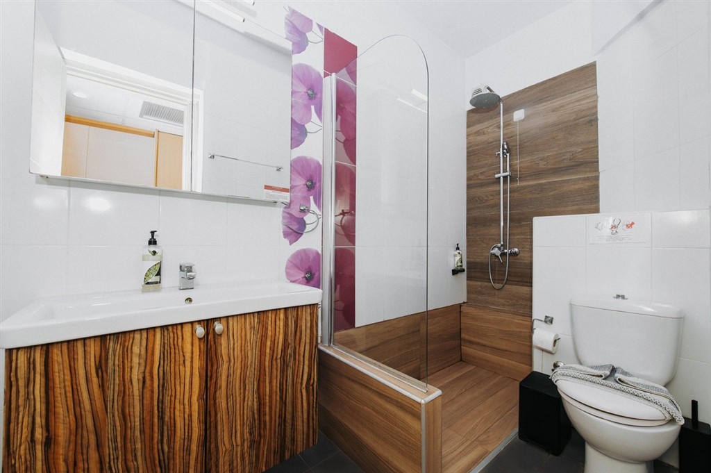 Kúpeľňa s vaňou je vybavená sprchovacím kútom a hydromasážnou vaňou.