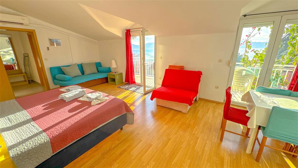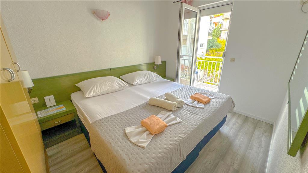 Apartmán disponuje ložnicí s manželským lůžkem a přistýlkami pro 3 osoby, vlastním sociálním zařízením se sprchou a kuchyňkou. Dále je k dispozici TV, WiFi připojení, klimatizace a balkon. Apartmán lze obsadit 2–5 osobami.