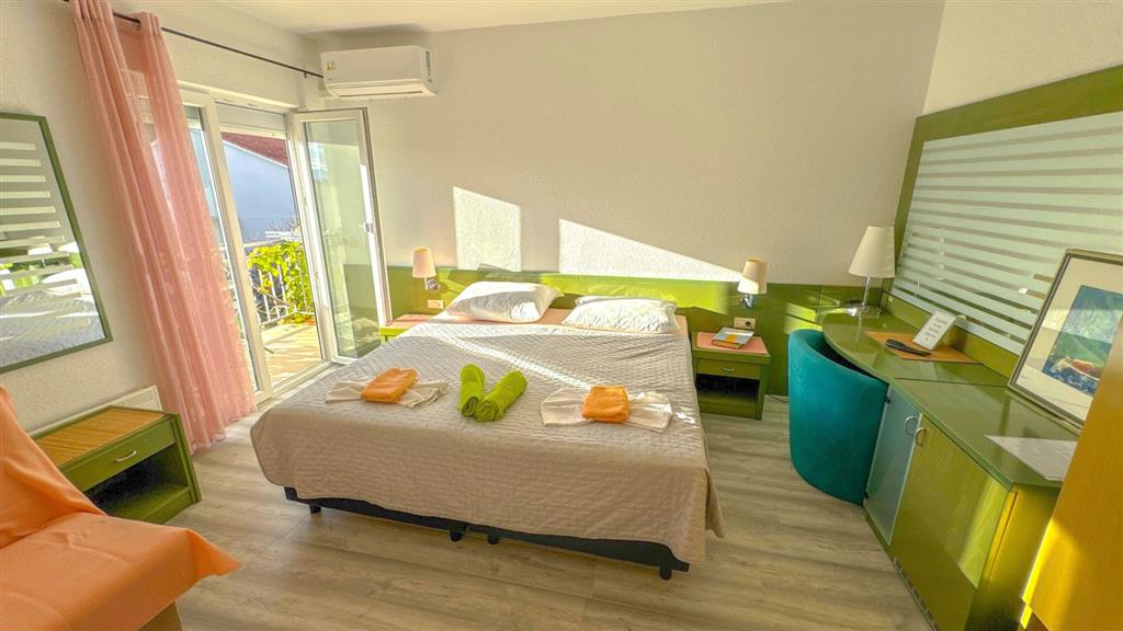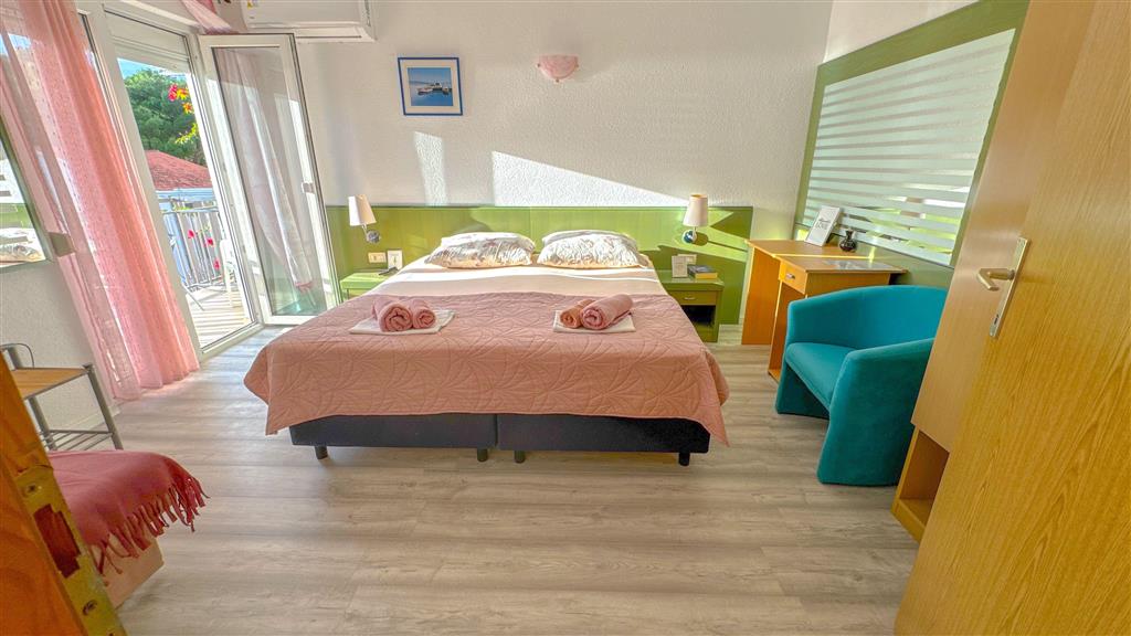 Apartmán disponuje ložnicí s manželským lůžkem a přistýlkou vhodnou pro dvě osoby (formou rozkládacího lůžka), vlastním sociálním zařízením se sprchou a kuchyňkou. Dále je k dispozici TV, WiFi připojení, klimatizace a balkon. Apartmán lze obsadit 2–4 osobami.