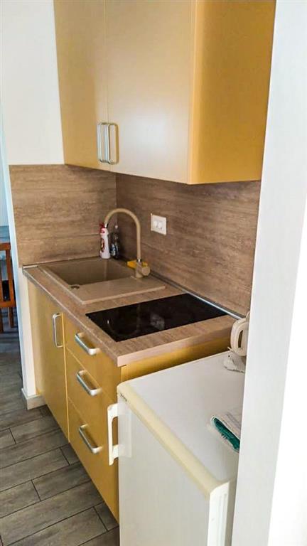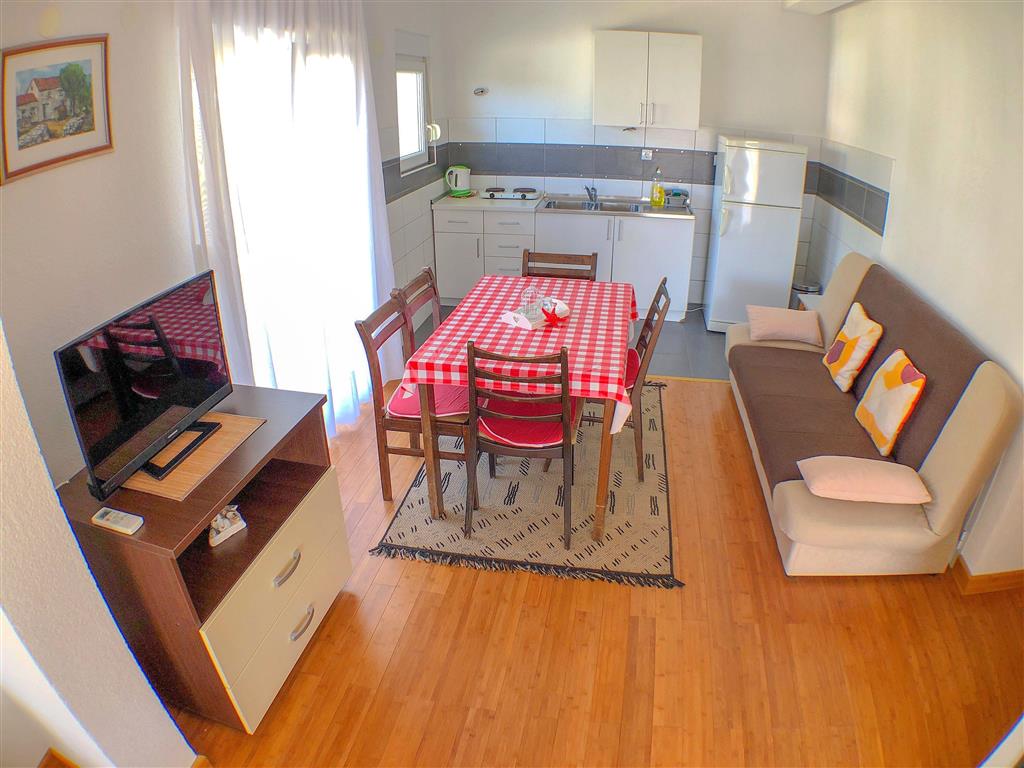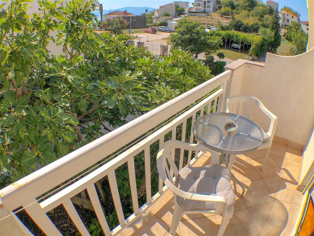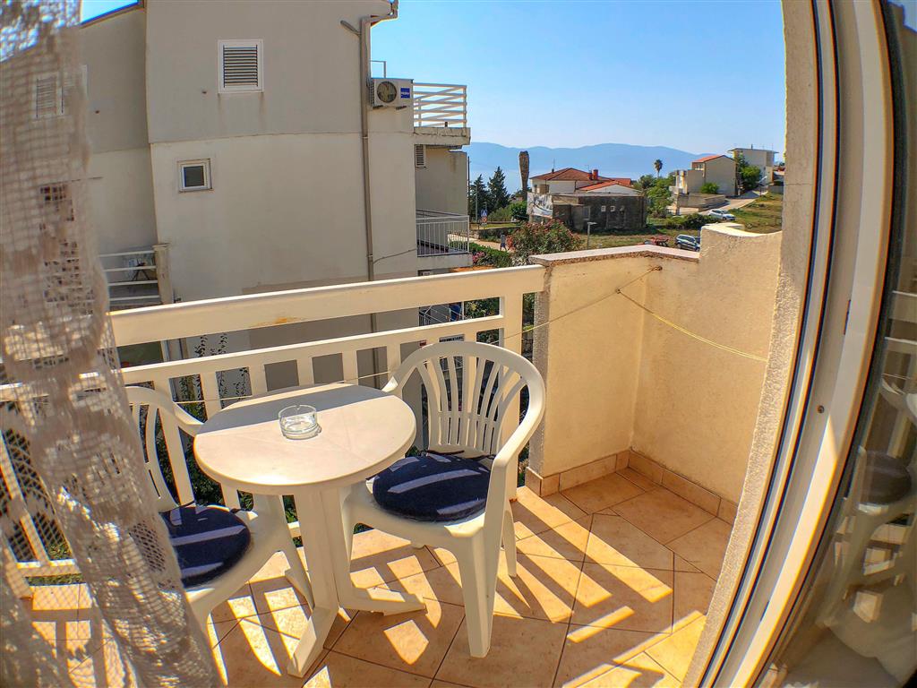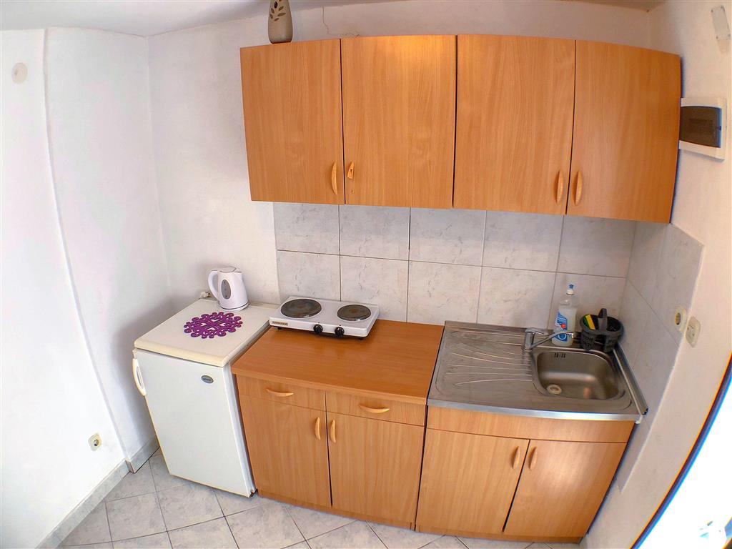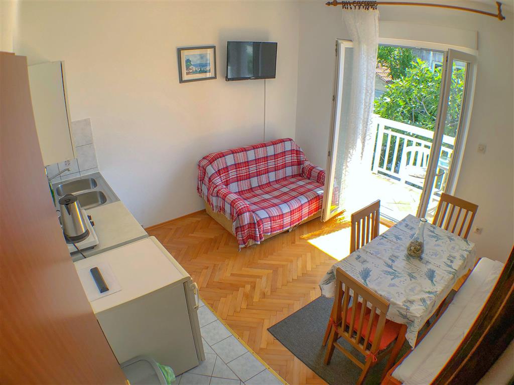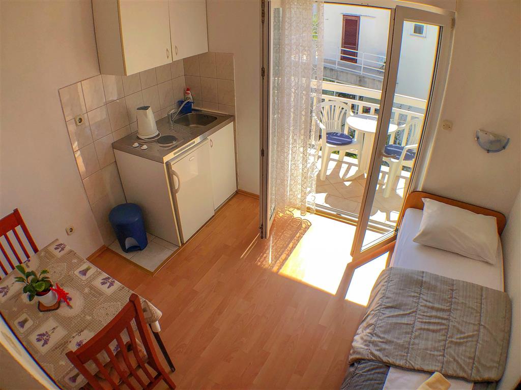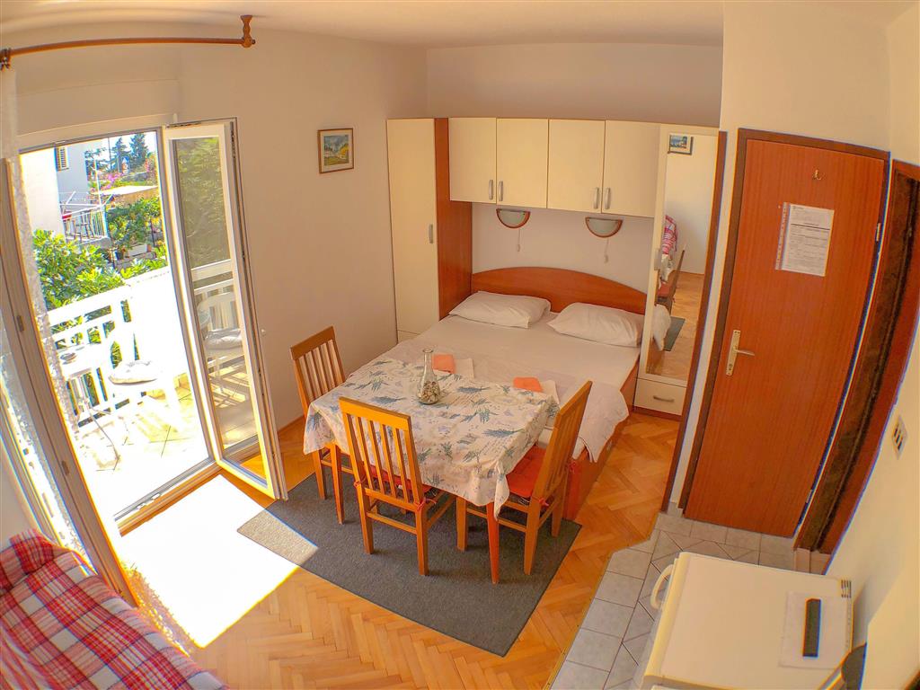 Studio se nachází v prvním patře apartmánového domu a disponuje místností s manželským lůžkem a samostatným lůžkem, vlastním sociálním zařízením a kuchyňkou. Dále je k dispozici SAT/TV, WiFi připojení, klimatizace a balkon. Studio lze obsadit 2–3 osobami.