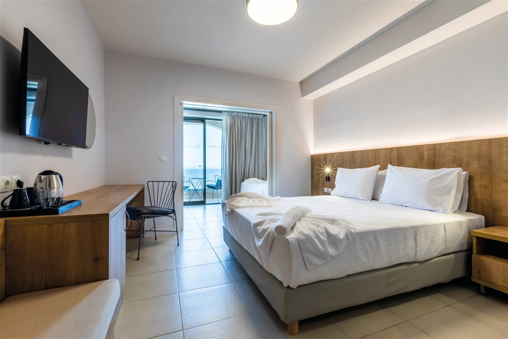 komfortné, moderne zariadené 2-lôžkové izby • klimatizácia • TV • trezor (zdarma) • kanvica na prípravu kávy a čaju • minichladnička • kúpeľňa so sprchou a WC • sušič na vlasy • balkón s posedením (výhľad na more za príplatok) •